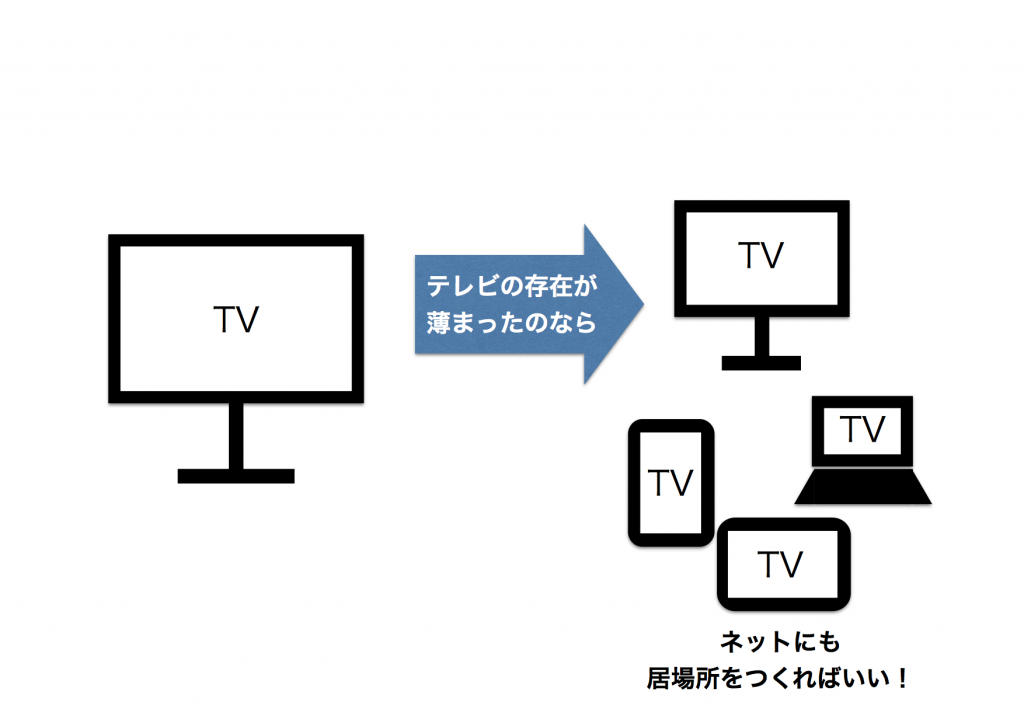 この「ふらりと観ることができる」ようになることは重要です。それはテレビという存在を大きく変えます。テレビはこれまで、時間通りにテレビ受像機で見るものでした。人びとの認識もそうですし、ビジネスモデル上もそうだった。これが、ふと思った時にどのデバイスでも観れてしまうもの、になるのです。全然違います。そして、その方がいまのメディアの接し方に乗っかれます。どこでも観れて、ひょいと噂になったらどのデバイスでも観ることができる。今の若い層からすると「だったら観るかもね」の俎上にのるでしょう。