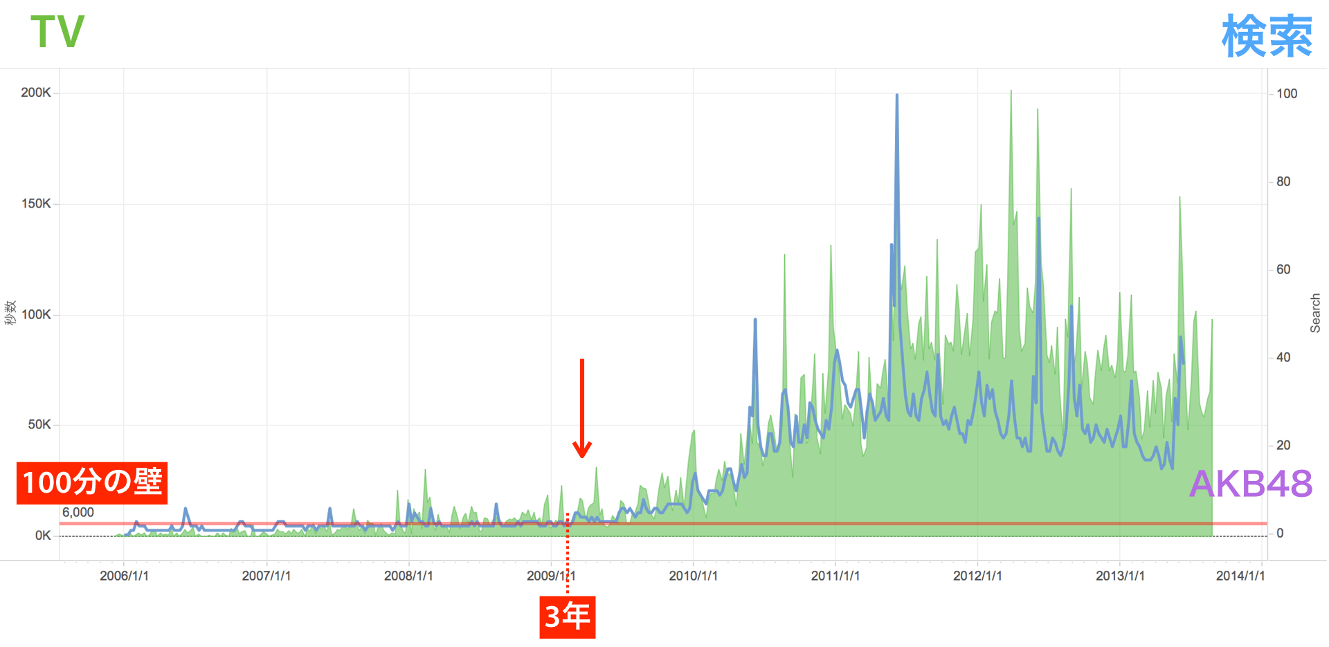 AKBが最初にテレビに登場したのは2005年の12月。当時は秋葉原の劇場を拠点に活動するグループで、ブレークどころかアイドルに直に会えることがウリの実験的な存在だった。今の地下アイドルのハシリと言ってもいいのかもしれない。だがその後の活躍は誰もが知るところで、彼女たちがトップアイドルとして一つの時代を築き上げた軌跡はこのグラフにも表れている。グラフ中の2012年前半のひときわ高い緑のスパイクは、AKBのテレビ番組露出が週20万秒(週55.5時間、1日平均7.9時間)を超えたことを表している。これは当時の日本のタレントの最高テレビ露出記録だ。文字通り、日本一のテレビタレントが誕生した瞬間である。青のラインで示した検索の数値も、2011年半ばに大きなピークを迎えている。だが、そのAKBのテレビ露出量や検索量が拡大し始めたのは2009年以降で、拡大期を迎える前に実はかなり長い助走期間があったことがお分かりいただけるであろうか。