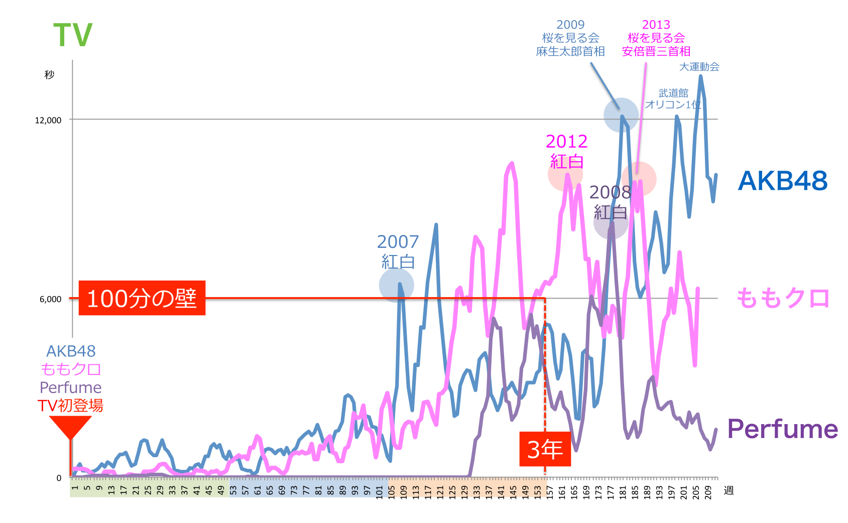 ももクロやPerfumeをご覧いただいても、紅白や桜を見る会のような露出チャンスが100分の壁越えに有効であることがお分かりいただけるだろう。