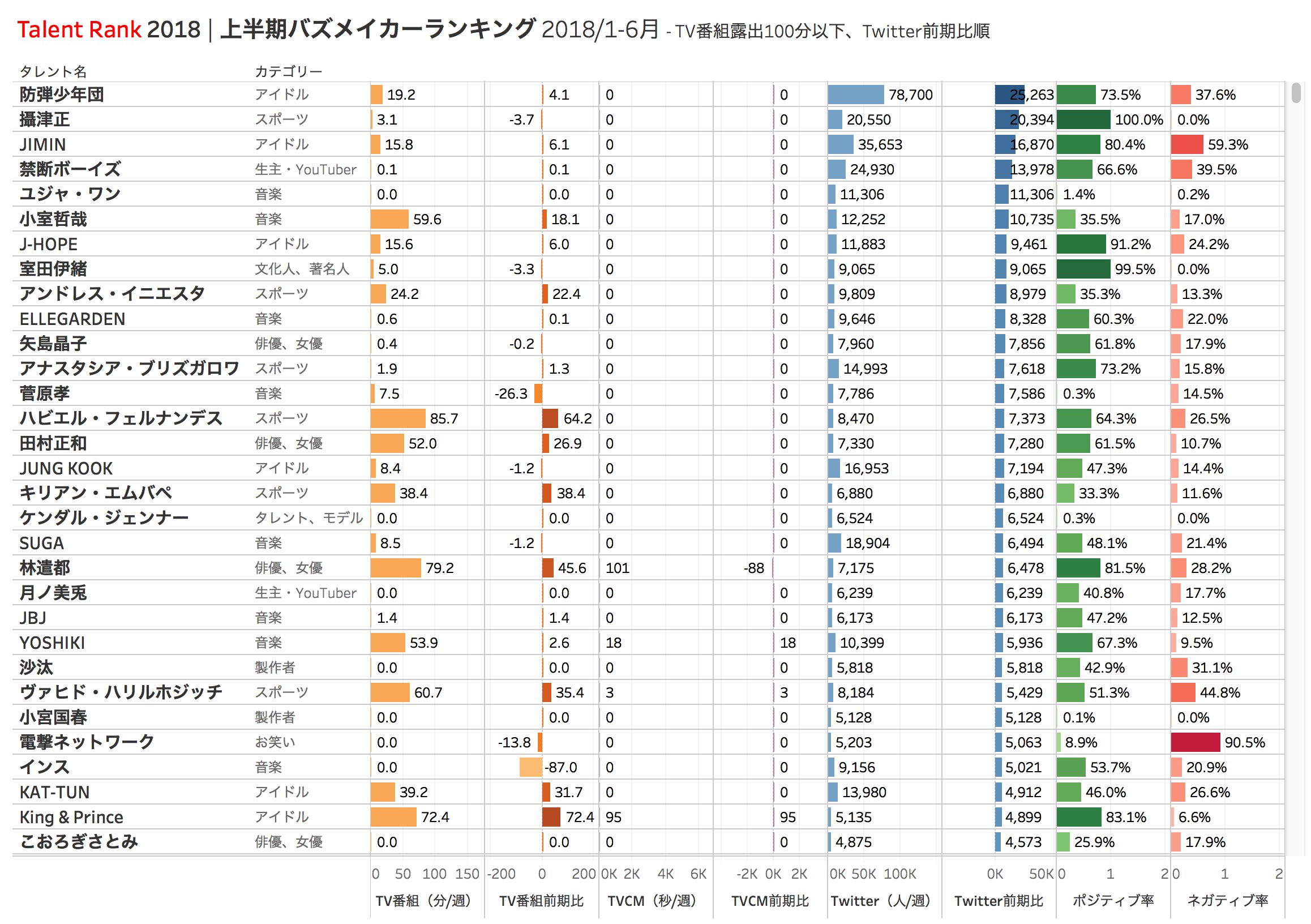 早速、「Talent Rank」のサマリー編「タレント四季報」を使って2018年上半期(1-6月)の「バズメイカー」ランキングを見ていこう。