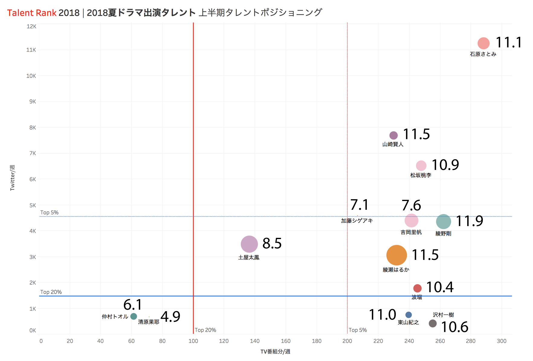早速図1をご覧いただこう。各タレントにつけた数字は各ドラマの初回世帯視聴率(ビデオリサーチ調べ、関東地区)だ。この数字はTalent Rankのポジショニングチャートに公表された数値を後から記入したものだ。