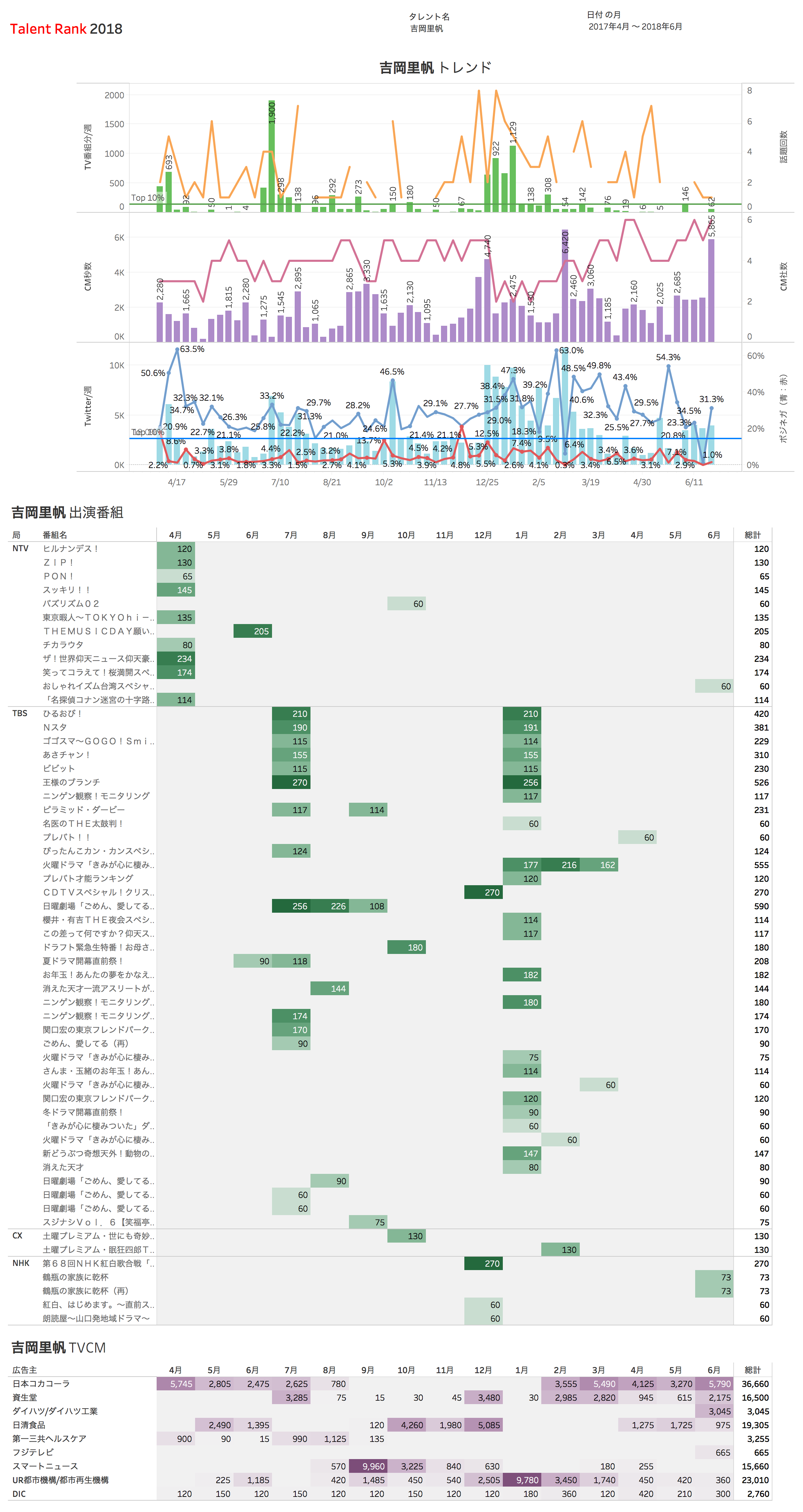 図2は吉岡のトレンドチャートだ。吉岡はTBSで2017年7-9月期と2018年1-3月期にドラマ出演していて、そのタイミングでTwitterも盛り上がっているのが分かる。特に昨年末の紅白出演から「きみが心に棲みついた」のドラマ出演の時期にかけては Twitter Top 10%を連続して超えるバズメイカー振りを発揮し、これが2018上半期の高いバズランクに反映されている。ただよく見ると吉岡のバズのピークは昨年末から2018年2月ぐらいまでで、3、4、5月ごろは必ずしも高い水準ではなかったことが分かる。3月はまだ「きみが心に〜」の放映期間、と言うよりむしろ最終回を迎える大切な期間であったがその頃から吉岡のバズは沈静化していき、ピークを過ぎていってしまったように見える。「きみが心に〜」の視聴率(ビデオリサーチ調べ、関東地区)も初回こそ9.4%であったが、2月後半には6%台にまで落ち込んでしまう。初期の期待値が維持できなかったパターンだ。