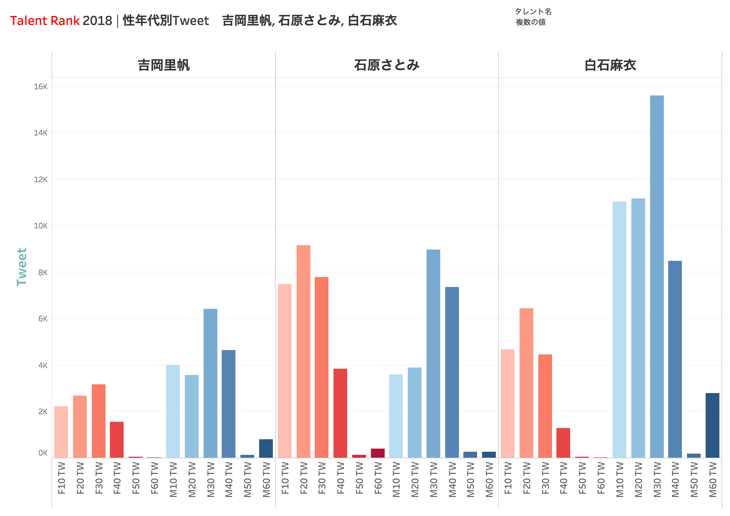 図3はその吉岡と、今季11.1%を記録した石原さとみ、そしてアイドルとの比較で吉岡と同年代の白石麻衣についてTweetしたユーザー数の性年代別データだ。