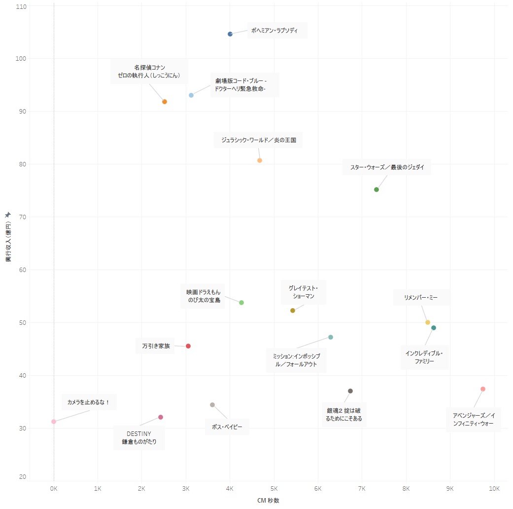 まずは前回のテレビ番組データと同じように、各作品の【TV-CMデータ】を関東での放送に絞り、公開前2週間、公開後2週間、計4週間分で抽出します。エム・データのTV-CMデータは、TV-CM出稿回数ごとにデータ化し、放送日時、局、広告主、商品・ブランド、タレント、クリエイティブ、テロップ情報などの詳細を記録しています。今回はこの中から商品・ブランドの項目で、上記対象の映画タイトルを検索して抽出しました。放送回別で4,907件出てきましたので、こちらを興行収入と紐づけてグラフ化します。