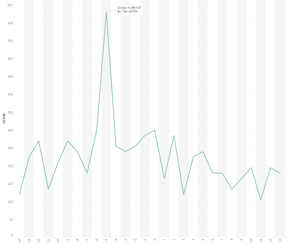 具体的にTV-CMの内容を見てみると、公開6日前が19件、その翌日5日前が22件と、件数自体は微増なのですが、通常15秒30秒CMであるのに対し、この日だけで60秒CMが1本、90秒CMが2本放送されていたことで秒数を伸ばしていました。こちらは「はじめてのミッション:インポッシブル」というタイトルで、シリーズ初心者が復習できるようにゆるいアニメーションで紹介するスペシャルアニメ映像として放送されていました。