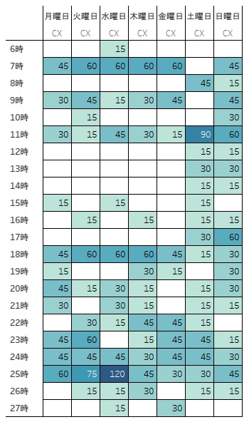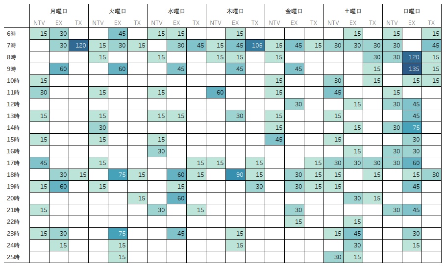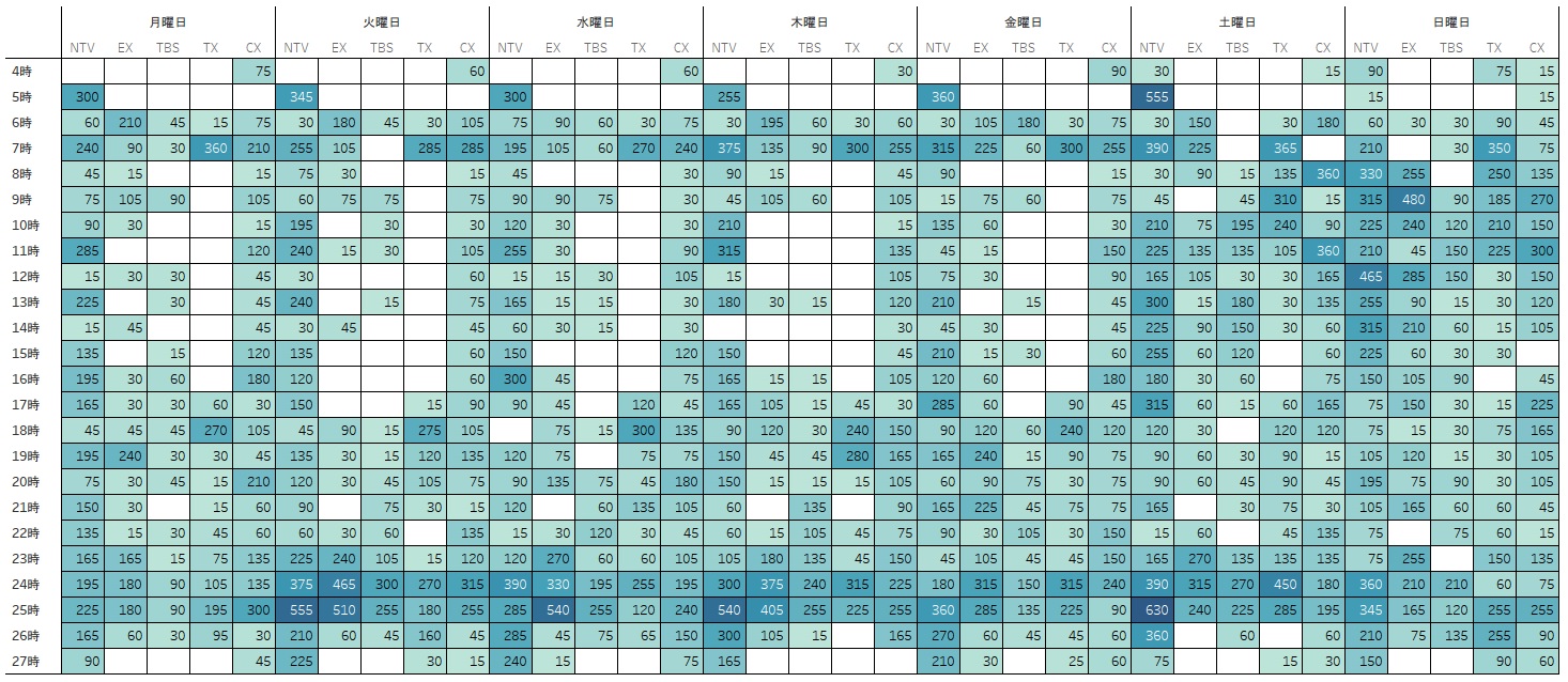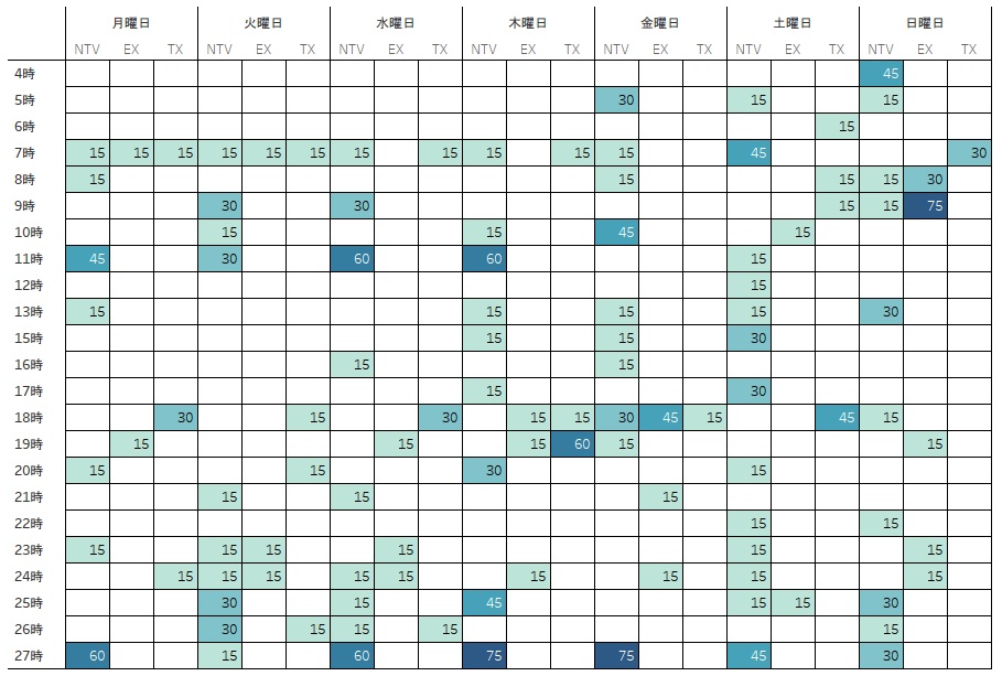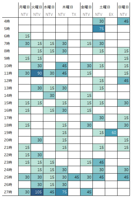 次に『コード・ブルー』はフジテレビのみでの露出でした。先ほどの『ドラえもん』はテレビ朝日が、『名探偵コナン』は日本テレビが同じように製作委員会に入っているものの他局でも放送されていましたが、こちらは局が限定されています。そのためもあってか、水曜日の25時台が高いほか、全体的に満遍なく配置されている印象を受けます。