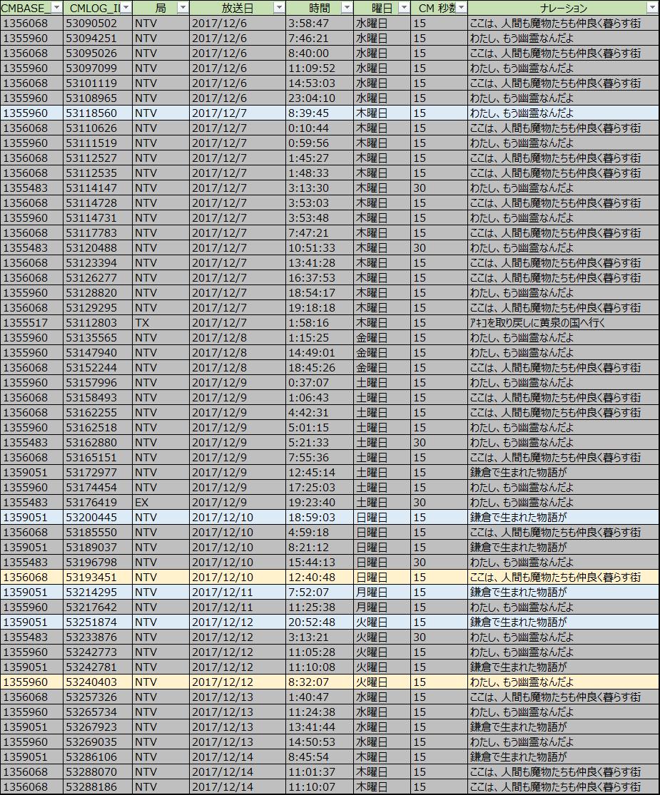 最後に冒頭で個人的によくTV-CMを見たと感じていた『DESTINY 鎌倉ものがたり』を見てみます。自分の生活スタイルにぴったりに合っているのかと思いきや、最も放送されている深夜の3時や早朝5時は寝ていますし、平日の11時は会社へ行っているので見ていません。あまり合致しないのに覚えがあるのは、主題歌である宇多田ヒカルさんの楽曲が印象的だったためでしょうか。