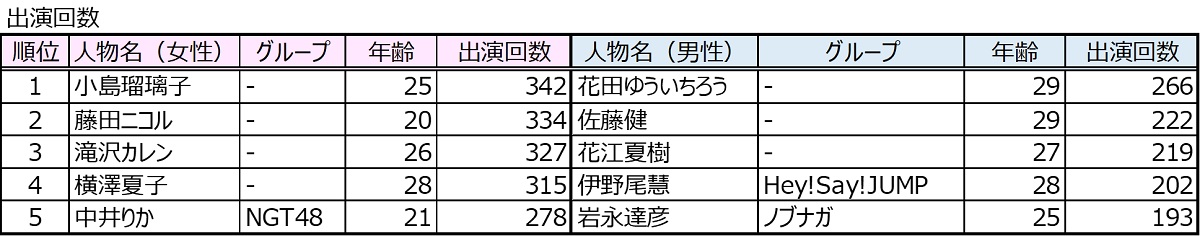 それでは、まずはテレビ番組の出演回数を見ていきましょう。