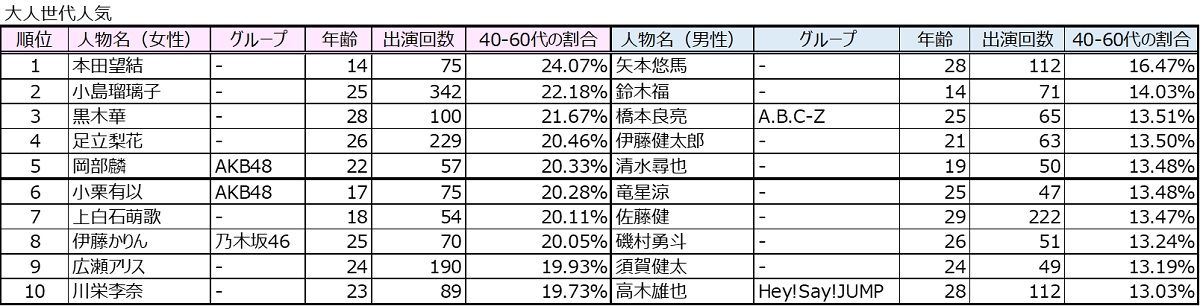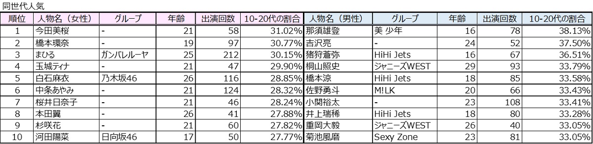 先日グループ名を改名し、今週デビューシングルの発売を予定している日向坂46と、ジャニーズJr.(美 少年とHiHi Jets)のランクインがあり、いずれもデビュー前のアイドルでした。これに紐づいているのか、先ほどの「大人人気」でランクインしたタレントの平均年齢が女性22.2歳、男性23.9歳だったのに対し、同世代では女性21.8歳、男性21.3歳と、年齢が低くなりました。