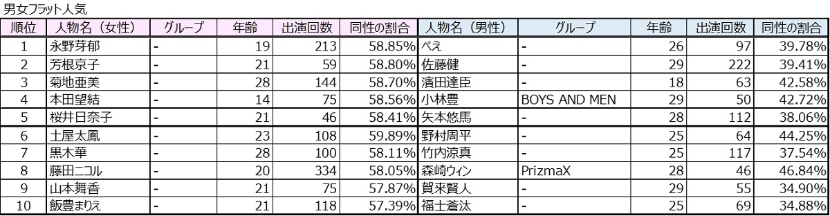 平均年齢は女性21.6歳、男性26.2歳、平均出演回数は女性127.2回、男性89.5回となりました。先ほどの年代別と比較すると、男女ともに出演回数がグンと高くなり、女性の平均年齢は低く、男性は高くなっています。これまでのランキングよりも同性票がやや高めになる選定のランキングであるため、同性になると女性は若めな人を、男性は大人な方を好む傾向があるということでしょうか。