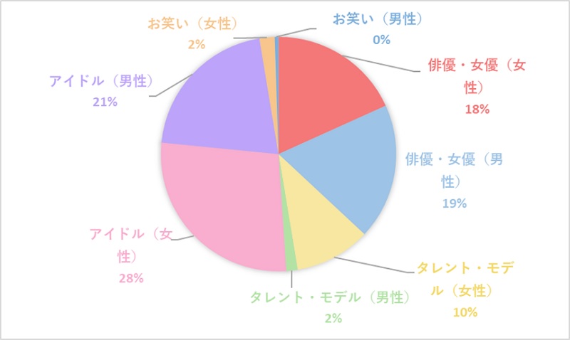 今回タレントの属性を「お笑い、俳優・女優、タレント・モデル、アイドル」で絞りましたが、内訳は下記の通りでした。