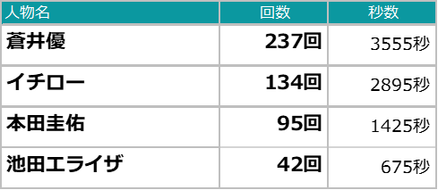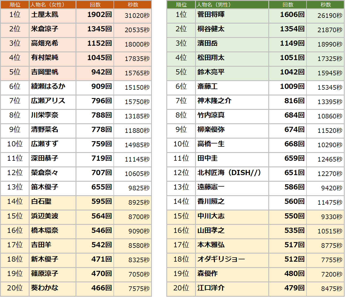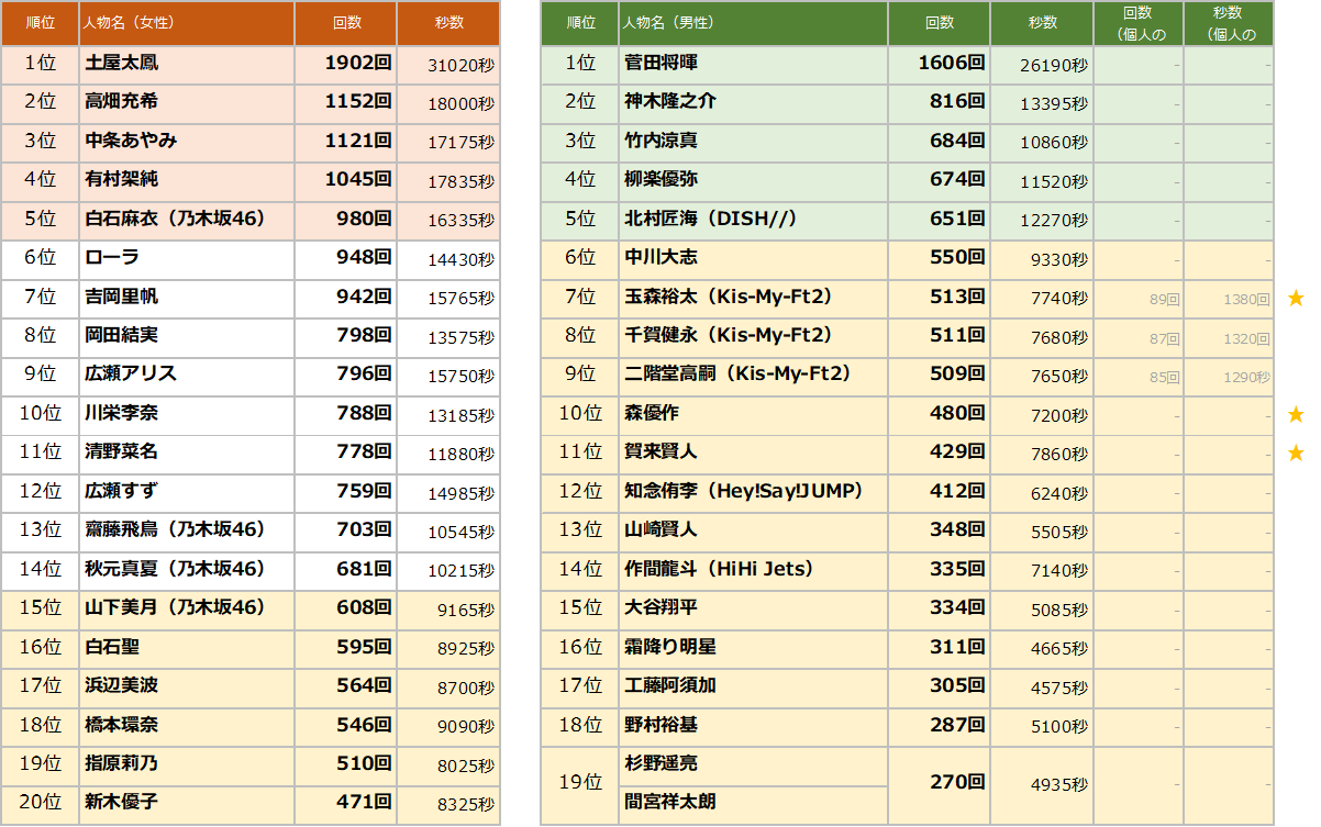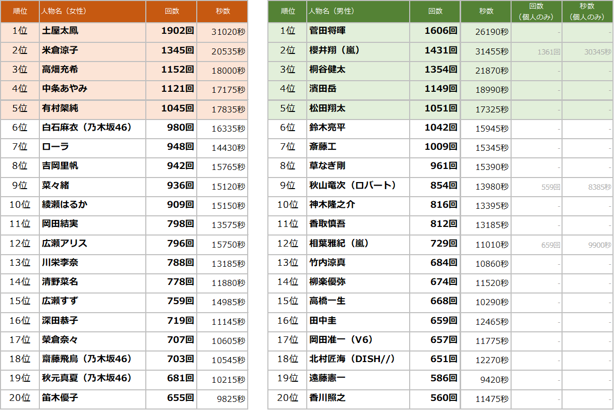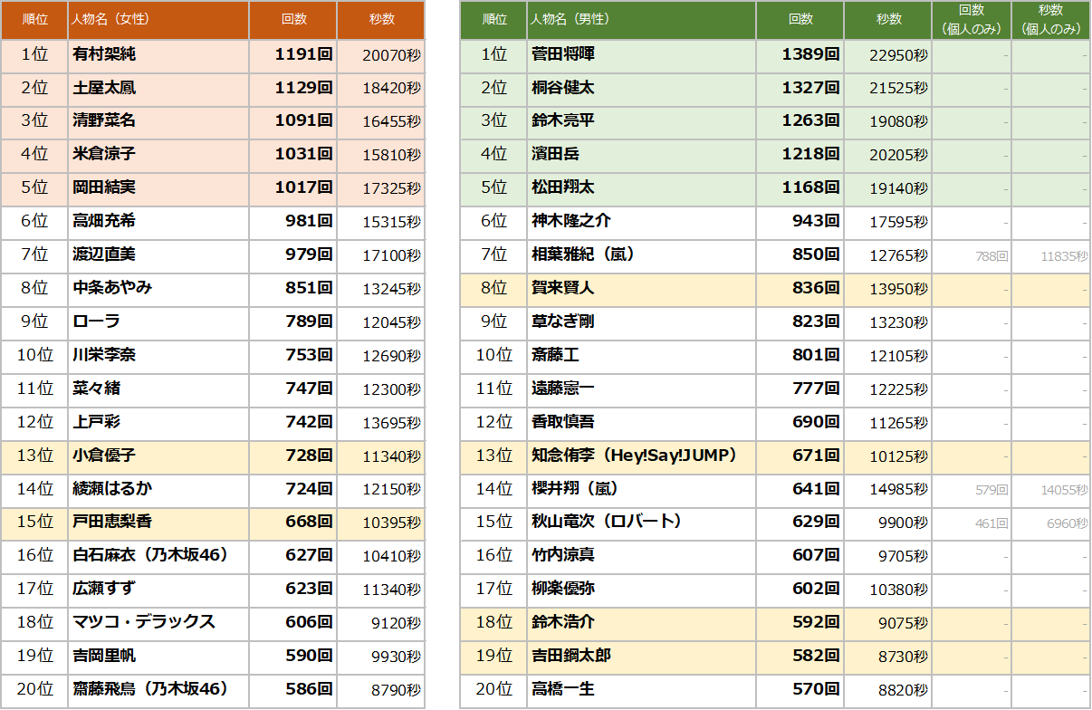 ※参考情報として、グループやコンビに所属しているタレントの「個人単位での出演」のみがある場合、個人の数値も併記しています。