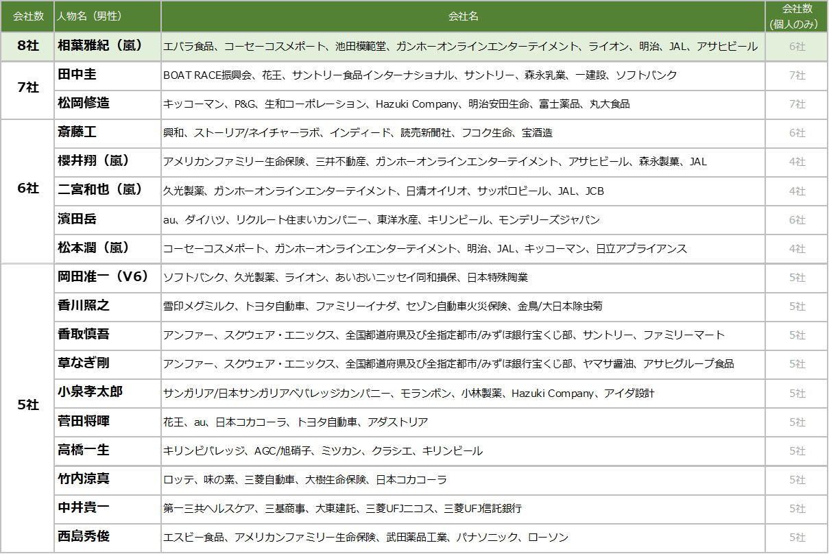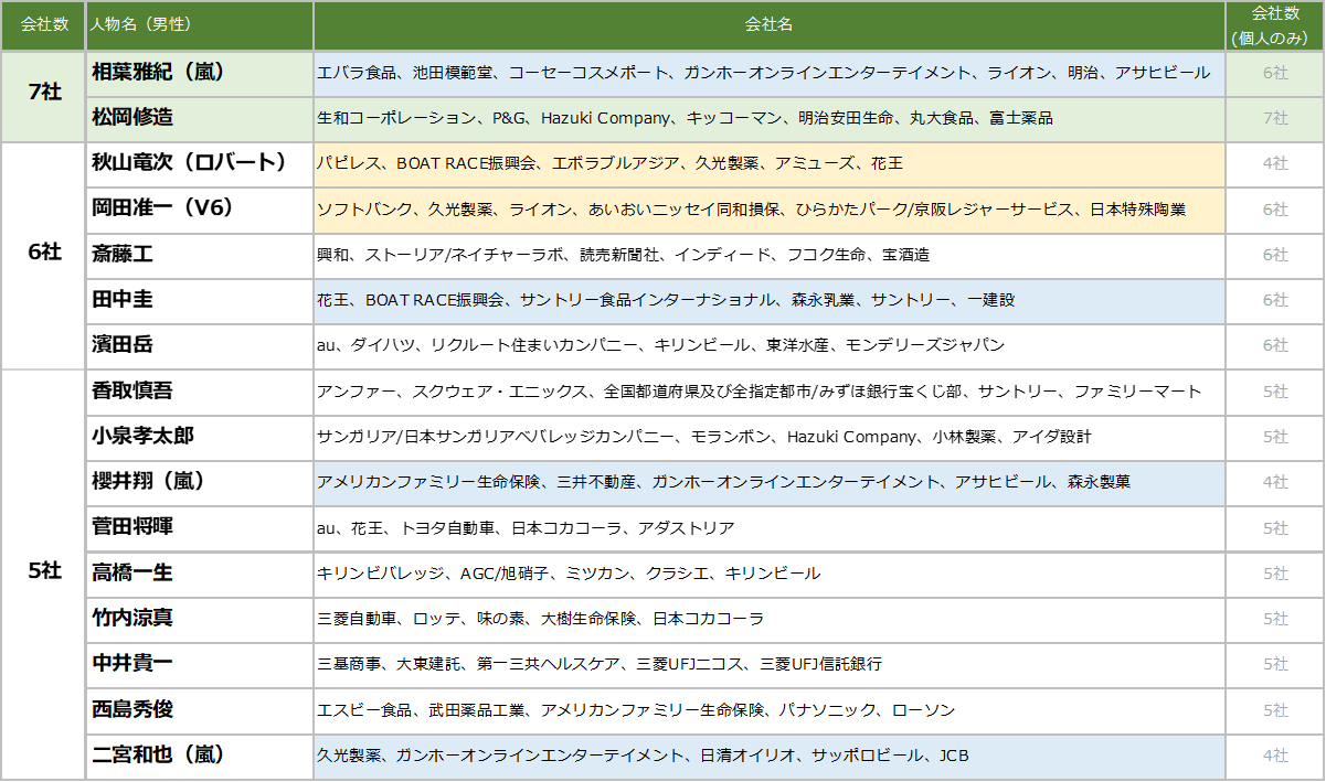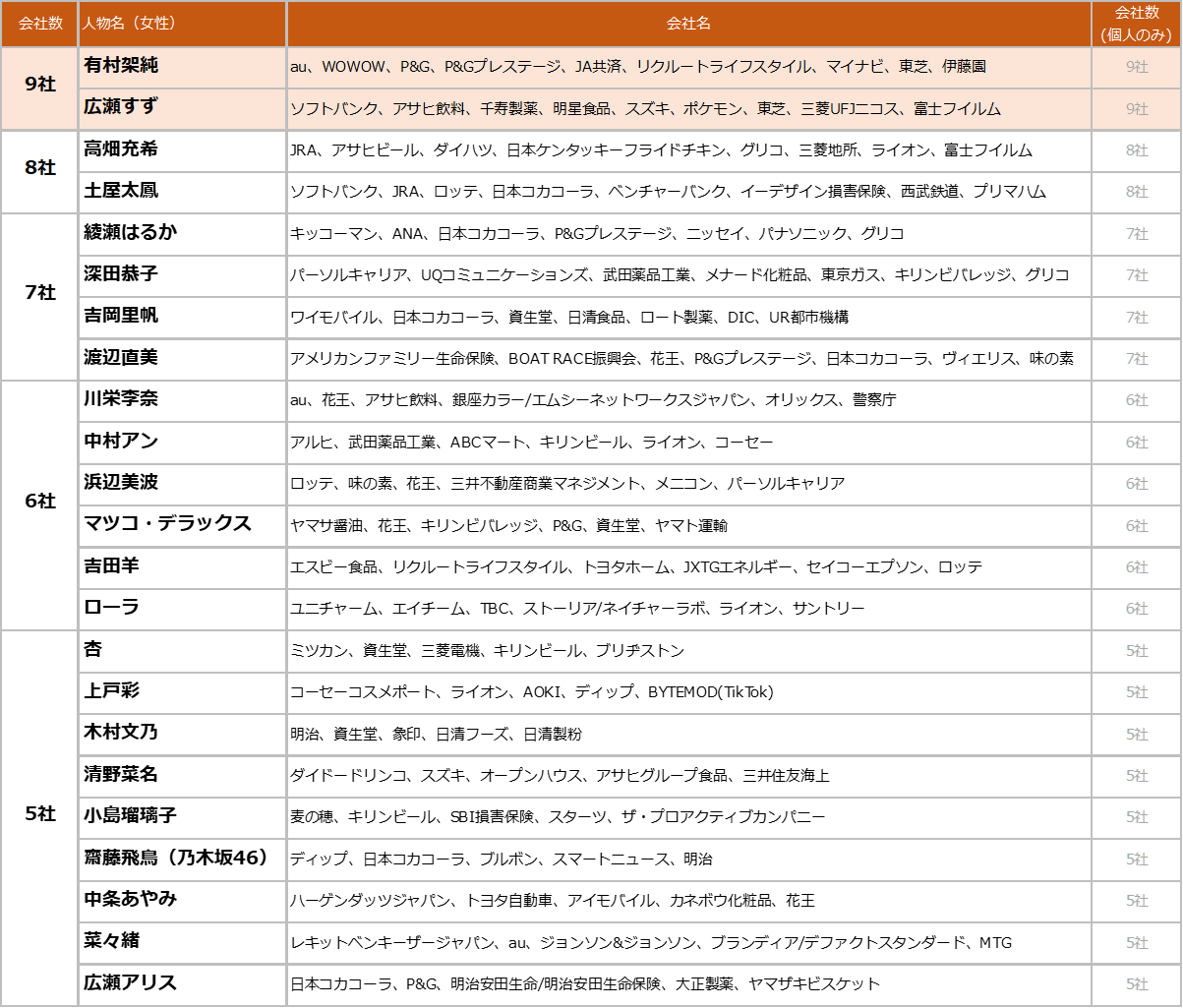 ※会社数ランキングは、タレントの契約期間や契約社数ではなく、調査期間内で放送されたタレントが出演しているTV-CMの会社の数にて集計をしています。
