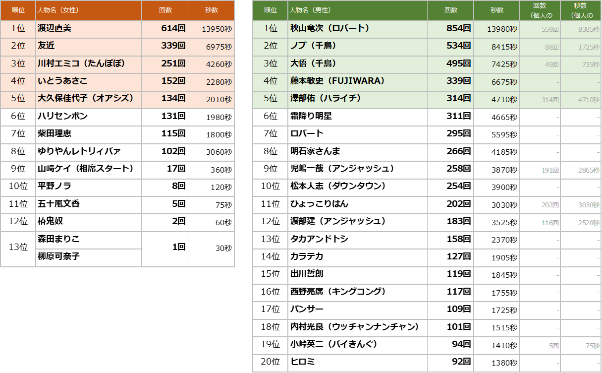 ロバートの秋山さん以外全て初ランクインになりましたので、図の初登場の方を黄色く塗るのをやめました。男性に比べ、女性のお笑い芸人が少ないことを実感します。