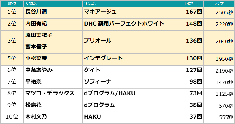 TV-CMタレント放送回数ランキング(関東/コスメ)