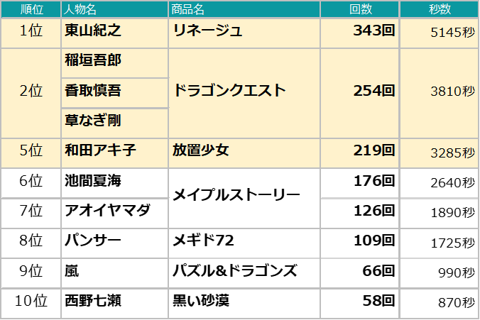 ゲームなのでもう少し学生世代へのアピールが強いと考えていましたが、上位は大御所の方で占められていたのが意外でした。知見がない人間のイメージですが若い方はネットからの流入が多そうなので、TVからは大人への訴求がメインなのでしょうか?
