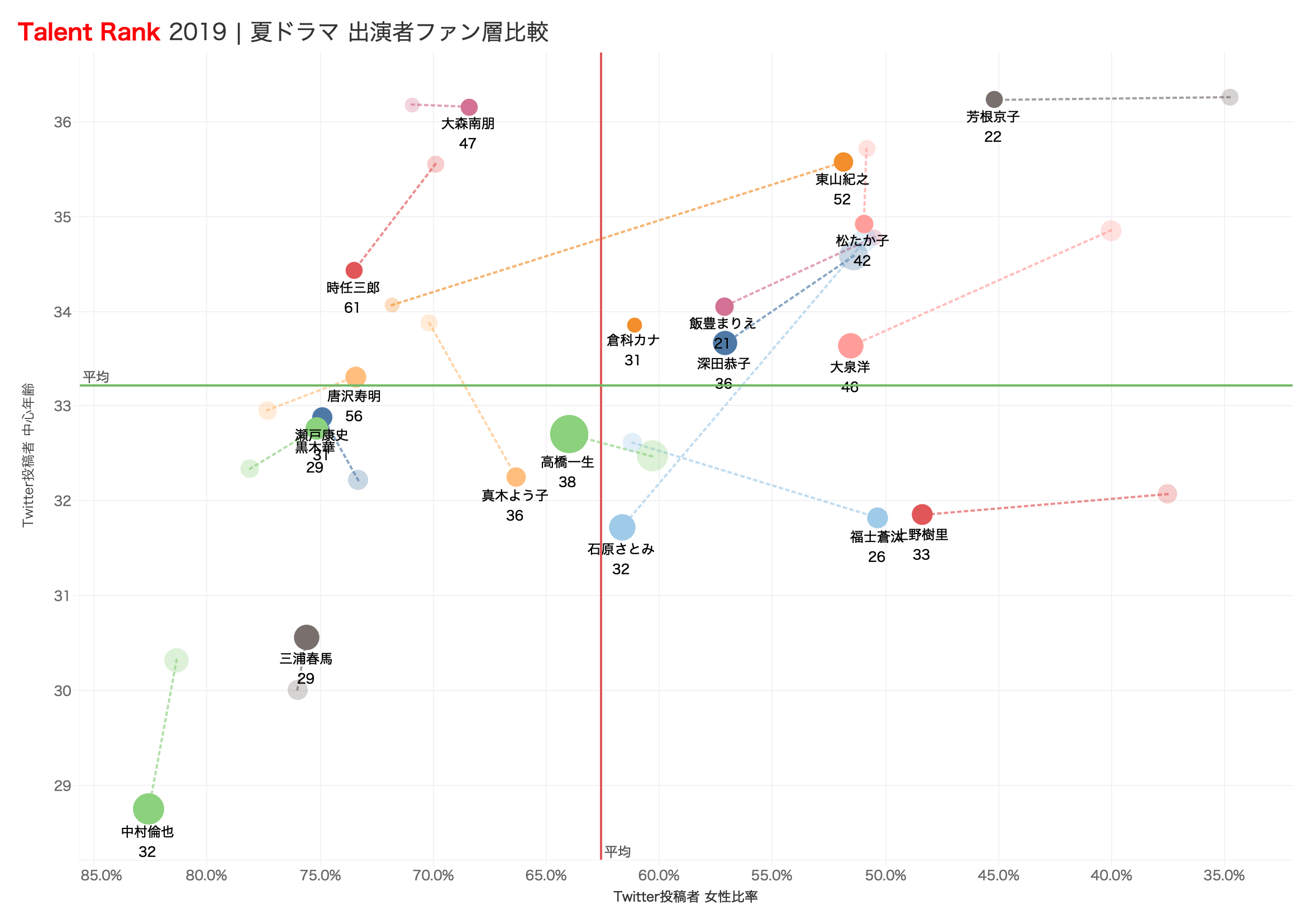 図1は、2019年7-9月期のプライムタイムに放映されているドラマの主演俳優のTwitter投稿者プロファイルだ。ドラマに出演している各俳優をTweetしている投稿者の性別、年齢の中心がどこにあるのかを、俳優別に表したものだ。それぞれの俳優がどんな性別、年齢の人にTweetされているのか、話題にされているのかを示した図だ。円の大きさは各俳優のTweet量を表しており、円の大きい俳優ほどたくさんTweetされていることを表している。点線でつながれた薄い色の円は夏ドラマ放映前の2019年6月のTwitter投稿者の状況、俳優名がついているほうの濃い円は夏ドラマ放映直後の7月の状況だ。各俳優ごとに夏ドラマ放映の前と後でどのように投稿者層に変化があったのかがわかる仕掛けだ。また俳優名についている数値は、その俳優の年齢を表している。