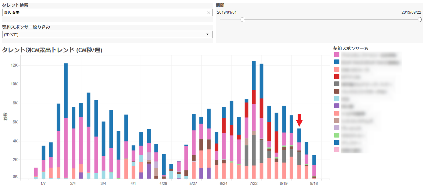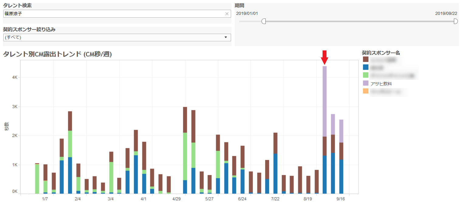 弊社のオンラインツールTV Rank( https://mdata.tv/tvrank/ )で長期的に篠原さんのCM出演推移を見ても、9/2週にアサヒ飲料によってガンと上がっています。(有料ツールなので一部データをぼかしています。また、クイズは回数を問う問題ですが、グラフは後述比較のため秒数になっています)