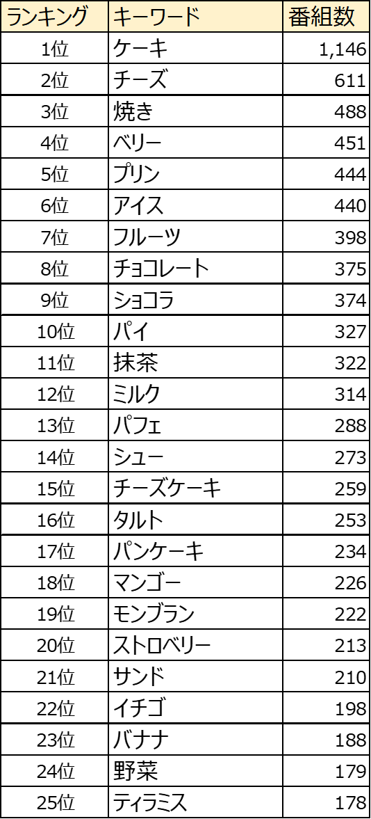 「スイーツ」というテーマで放送されたテレビ番組のTVメタデータから、「スイーツ」とともに出てきた共起語のキーワード露出数を以下のようにランキング化することができます。