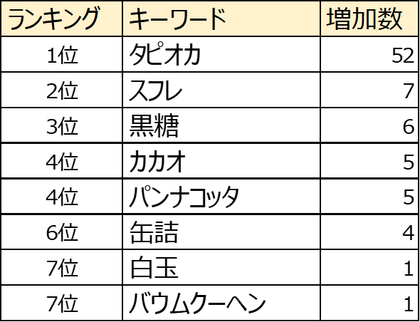 近年のテレビ露出増加数の1位は、一大ムーブメントを起こした“タピオカ”となりました。2位以下もタピオカに比べて数字の爆発力こそないものの、ここ2年でじわじわテレビ露出が増加し注目が集まっていることが伺え、たとえば新商品としてこれらに力を入れていくような選択肢が考えられるかもしれません。