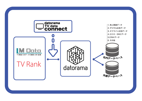 また、エム・データ内のビッグデータ解析プロジェクト「ライフログ総合研究所(Life Log Lab.)」(所長:梅田仁)が提供するビッグデータ分析サービス「TV Rank」とも連携し、TVメタデータによる「認知」から、Web検索データでの「関心度」、SNSデータによる「好感・意向度」、POSデータによる「購入」までをマーケティングファネルで分析し、視聴者の態度変容やインサイトを行い、競合ブランドとのポジショニング、時系列トレンド、施策のパフォーマンス、ROIなどDatorama上で指標化・可視化するダッシュボード展開を計画しております。