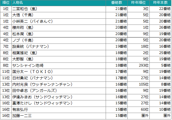 トップは「二宮和也(嵐)」「大悟(千鳥)」「小峠英二(バイきんぐ)」で21番組に出演!