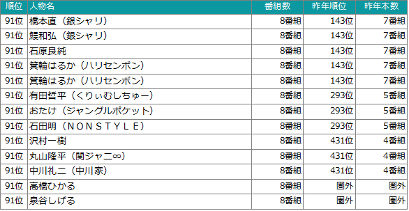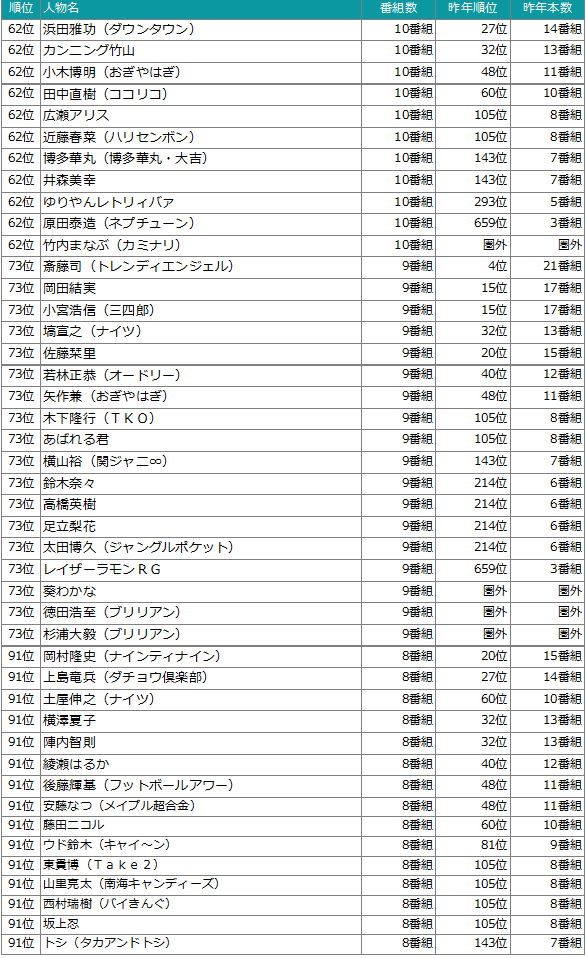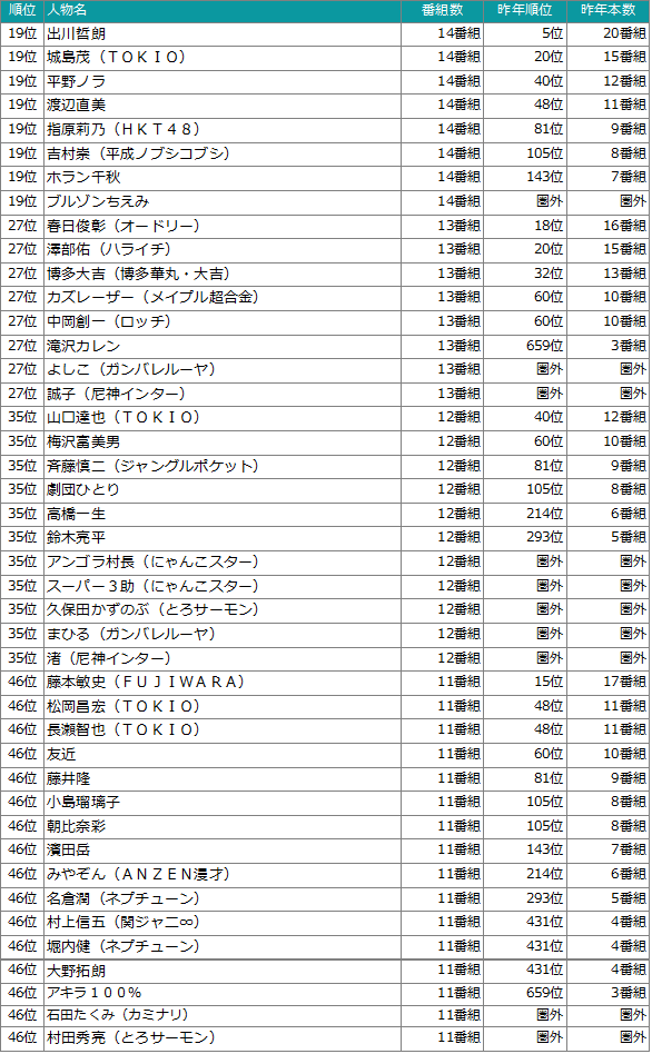- 調査対象:NHK総合(Eテレ除く)、日本テレビ、テレビ朝日、TBS、テレビ東京、フジテレビ(東京地区地上波)で放送されたTV番組(再放送番組含む)にレギュラー出演、ゲスト出演した人物を対象。