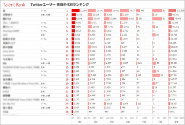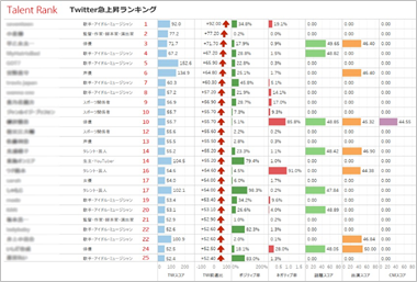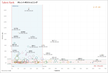 (TV話題スコア、TV出演スコア、TVCMスコア、Tweetスコア、それらを統合した総合スコアによるタレントや著名人のパワーランキング、ネクストブレイカーランキング、Twitterユーザーの性別年代別ランキング など) - タレントや著名人のポジショニングマップ