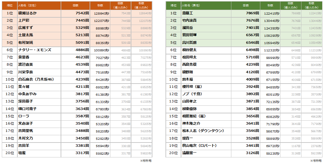 ※ グループやコンビに所属しているタレントは、「個人単位での出演」と「グループ・コンビ単位での出演」を合わせて集計しランキングしています。