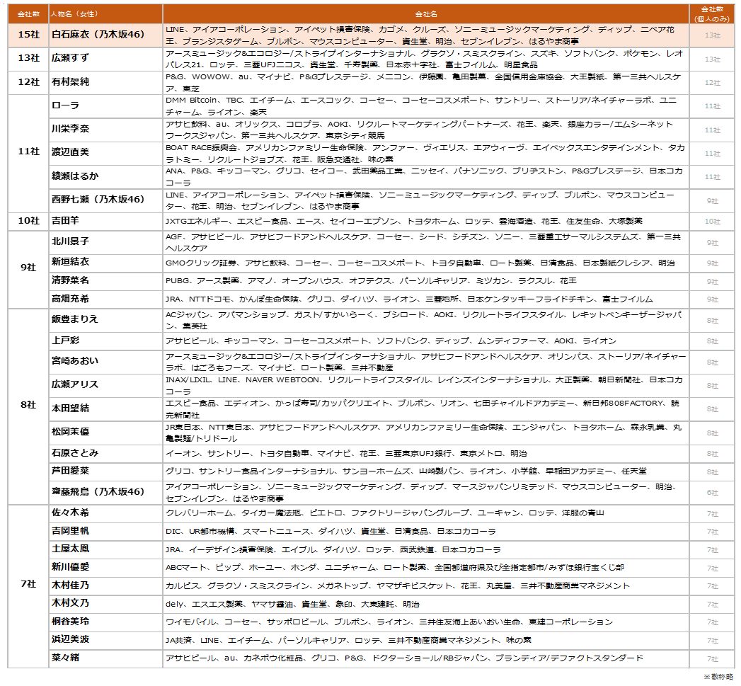 上位では、川栄李奈さんが11社で堂々のランクイン!