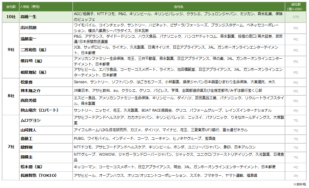 ※ 会社数ランキングは、タレントの契約期間や契約社数ではなく、調査期間内で放送されたタレントが出演しているTV-CMの会社の数にて集計をしています。