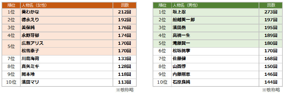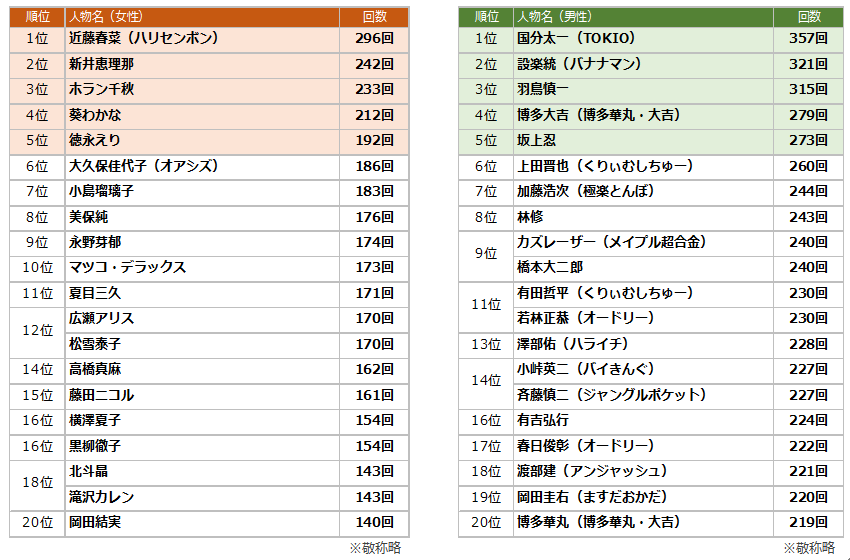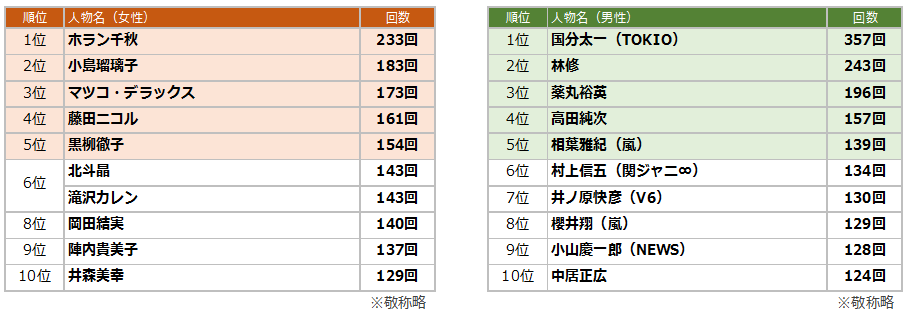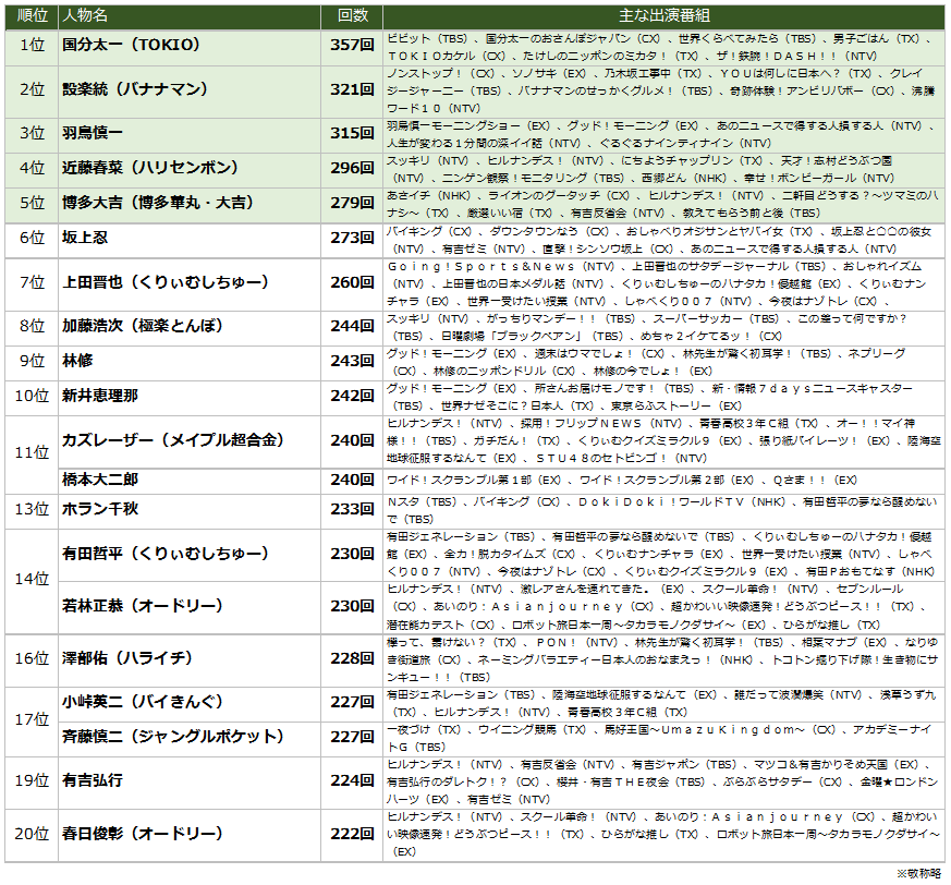 - 調査対象:NHK総合、日本テレビ、テレビ朝日、TBS、テレビ東京、フジテレビ(東京地区地上波キー局)で放送されたTV番組(再放送含む)にレギュラー出演、ゲスト出演した人物を対象。