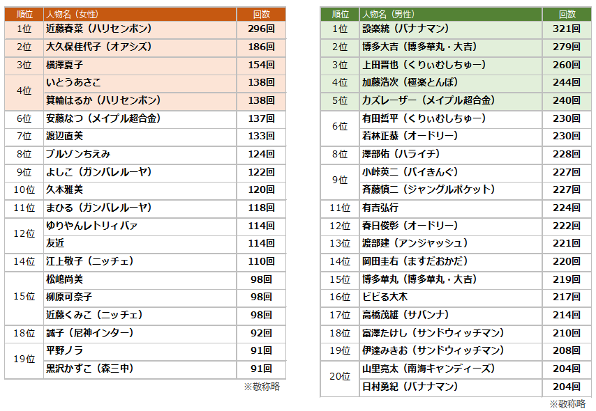 ■2018年上半期TV番組 出演ランキング(お笑い 女性・男性)