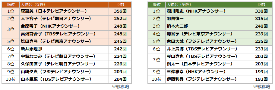 ※ 放送局所属のアナウンサーは、総合ランキング、総合男女ランキングでは対象外としています。
