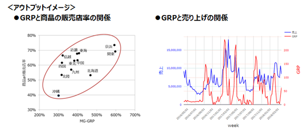 さらに、全国CMマスタと、インテージが提供しているSRI©(全国小売店パネル調査)およびSCI©(全国消費者パネル調査)のベースとなる商品マスタ(商品情報データベース)との連携により、商品の販売、購買実績とテレビCMの放送実績を紐づけてGRPと販売店率や売り上げとの関係を把握し、テレビCMキャンペーンの効果測定に活用することも可能です。