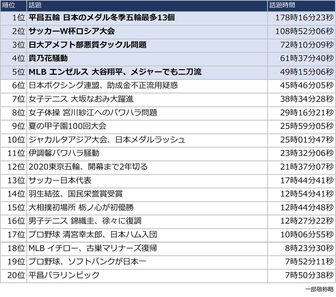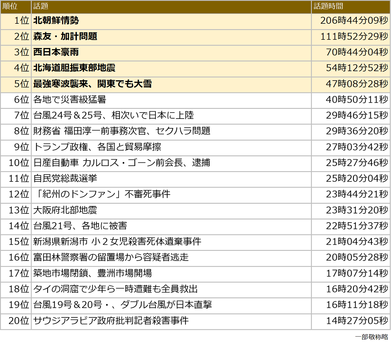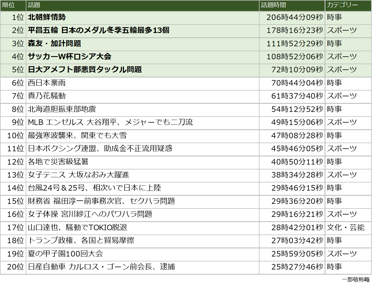総合トップは「北朝鮮情勢」で206時間44分09秒。「時事、スポーツ、文化・芸能」の分野別ランキングも発表!