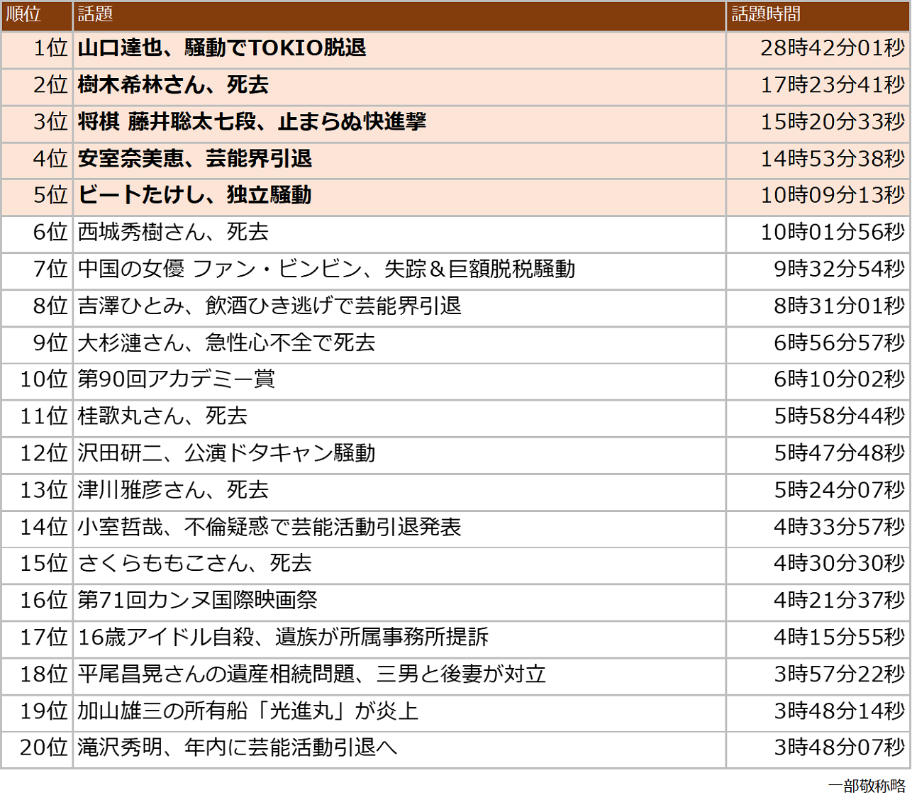 文化・芸能トップは 「山口達也、騒動でTOKIO脱退」
