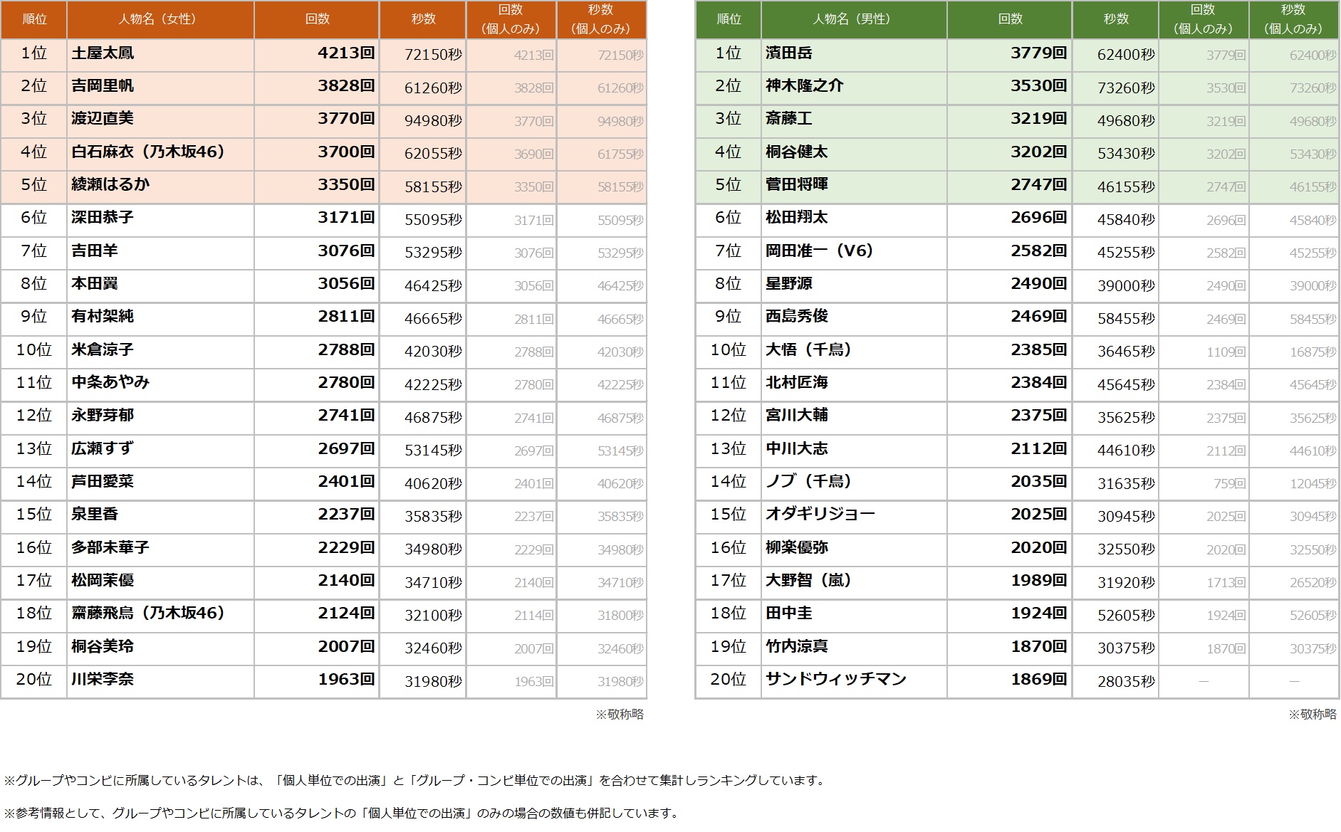 ※ グループやコンビに所属しているタレントは、「個人単位での出演」と「グループ・コンビ単位での出演」を合わせて集計しランキングしています。
