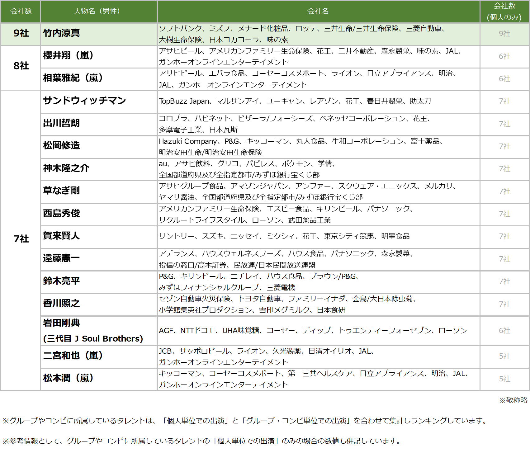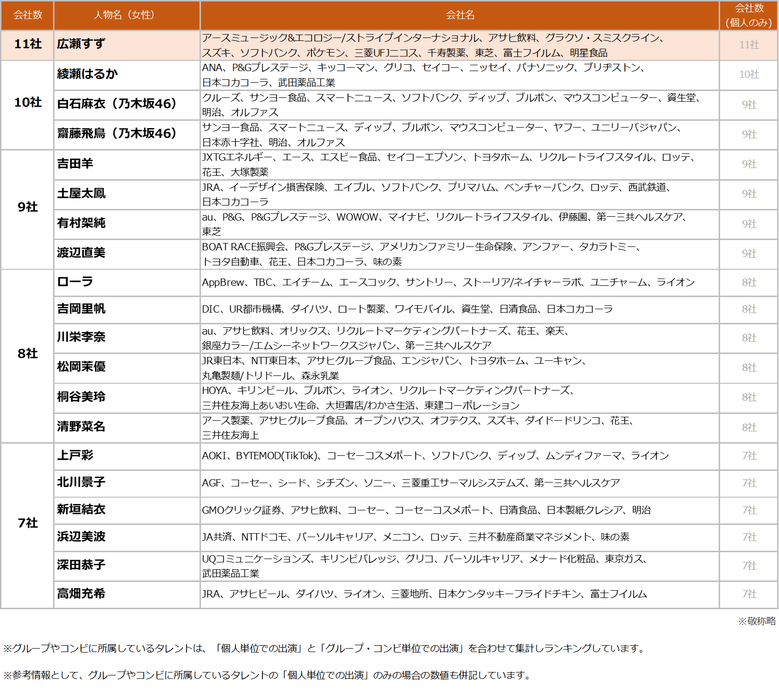※ 会社数ランキングは、タレントの契約期間や契約社数ではなく、調査期間内で放送されたタレントが出演しているTV-CMの会社の数にて集計をしています。