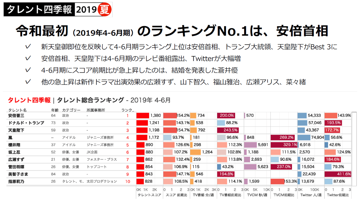 「タレント四季報 2019年夏(4-6月号)」での、TV番組出演、TV番組での話題、TV-CM出演、ツイートされた数を総合したスコア(タレントパワーを示す独自指標)のランキング上位は、安倍首相、トランプ大統領、天皇陛下となり「新天皇御即位」や「G20」を反映してTV番組露出とツイート数が多くを占め、また同じくランキング上位の蒼井優は前回のランキングから急上昇していることから 、結婚発表の影響が大きいことが言える結果となりました。