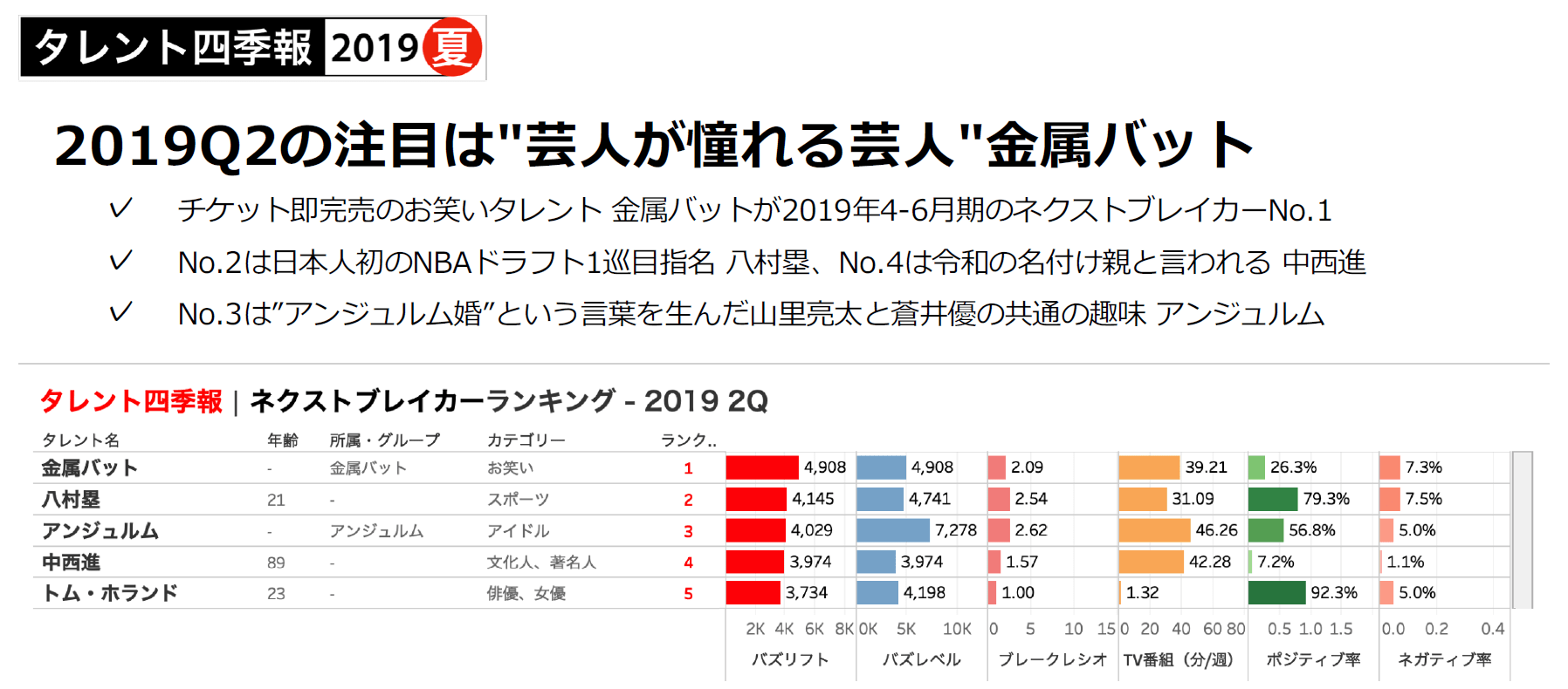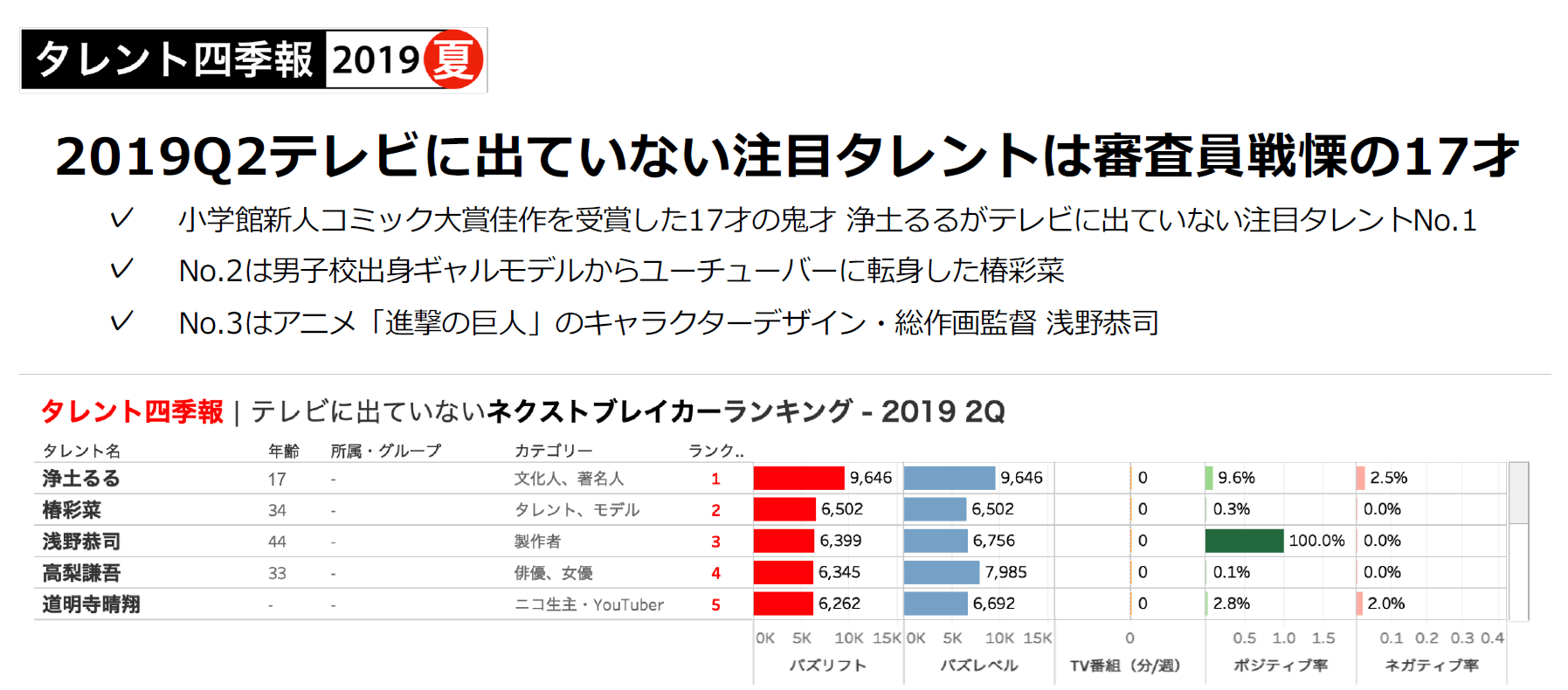 テレビの放送内容をテキスト化した「TVメタデータ」を提供する株式会社エム・データ(本社:東京都港区、代表取締役: 関根俊哉)と、エム・データ内のビッグデータ解析プロジェクト「ライフログ総合研究所(Life Log Lab. 略称“L3”)」(所長:梅田仁)は、タレントパワーを可視化する「Talent Rank(※1)」から、四半期毎にレポーティングするサービス「タレント 四季報 2019夏(4-6月号)」を発表し、販売を開始しました。