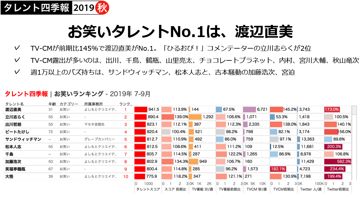 「タレント四季報 2019年秋(7-9月)号」での、TV番組出演、TV番組での話題、TV-CM出演、ツイートされた数を総合したスコア(タレントパワーを示す独自指標)のカテゴリー別ランキング「お笑い」の上位は、渡辺直美、立川志らく、出川哲朗となり、1位の渡辺直美はTV-CMの出演が圧倒的に多く、前期比145%でスコアを伸ばし、2019年に入ってからは1位をキープしています。2位の立川志らくは、TBS系列の帯番組「ひるおび!」にレギュラー出演を行っていることから上位に押し上げ、3位の出川哲朗は、TV番組への出演や話題、TV-CMへの出演、ツイート数をコンスタントに獲得した結果となりました。また、8位に急浮上した加藤浩次ですが、ツイートが前期比582%を超えており、この要因は吉本騒動によるものと考えられます。
