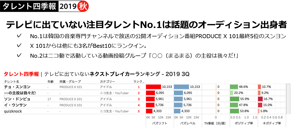 テレビの放送内容をテキスト化した「TVメタデータ」を提供する株式会社エム・データ(本社:東京都港区、代表取締役: 関根俊哉)と、エム・データ内のビッグデータ解析プロジェクト「ライフログ総合研究所(Life Log Lab. 略称“L3”)」(所長:梅田仁)は、タレントパワーを可視化する「Talent Rank(※1)」から、四半期毎にレポーティングするサービス「タレント四季報 2019秋(7-9月)号」を発表し、販売を開始しました。