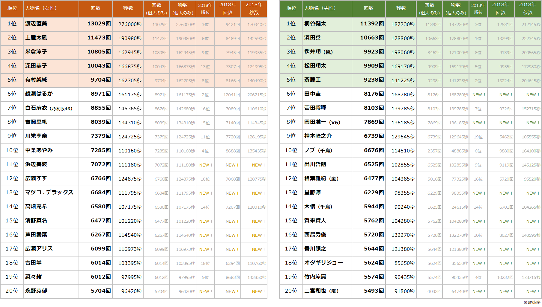 女性トップは渡辺直美さん、男性トップは桐谷健太さん