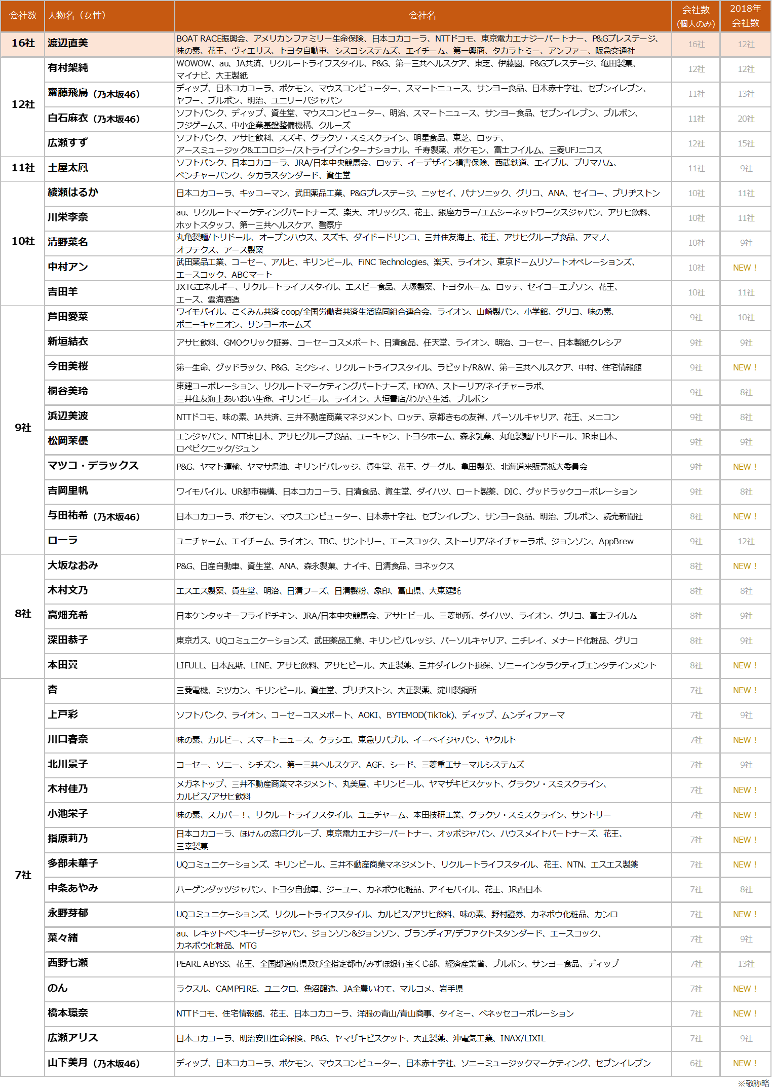女性トップは、W受賞の渡辺直美さん(16社)