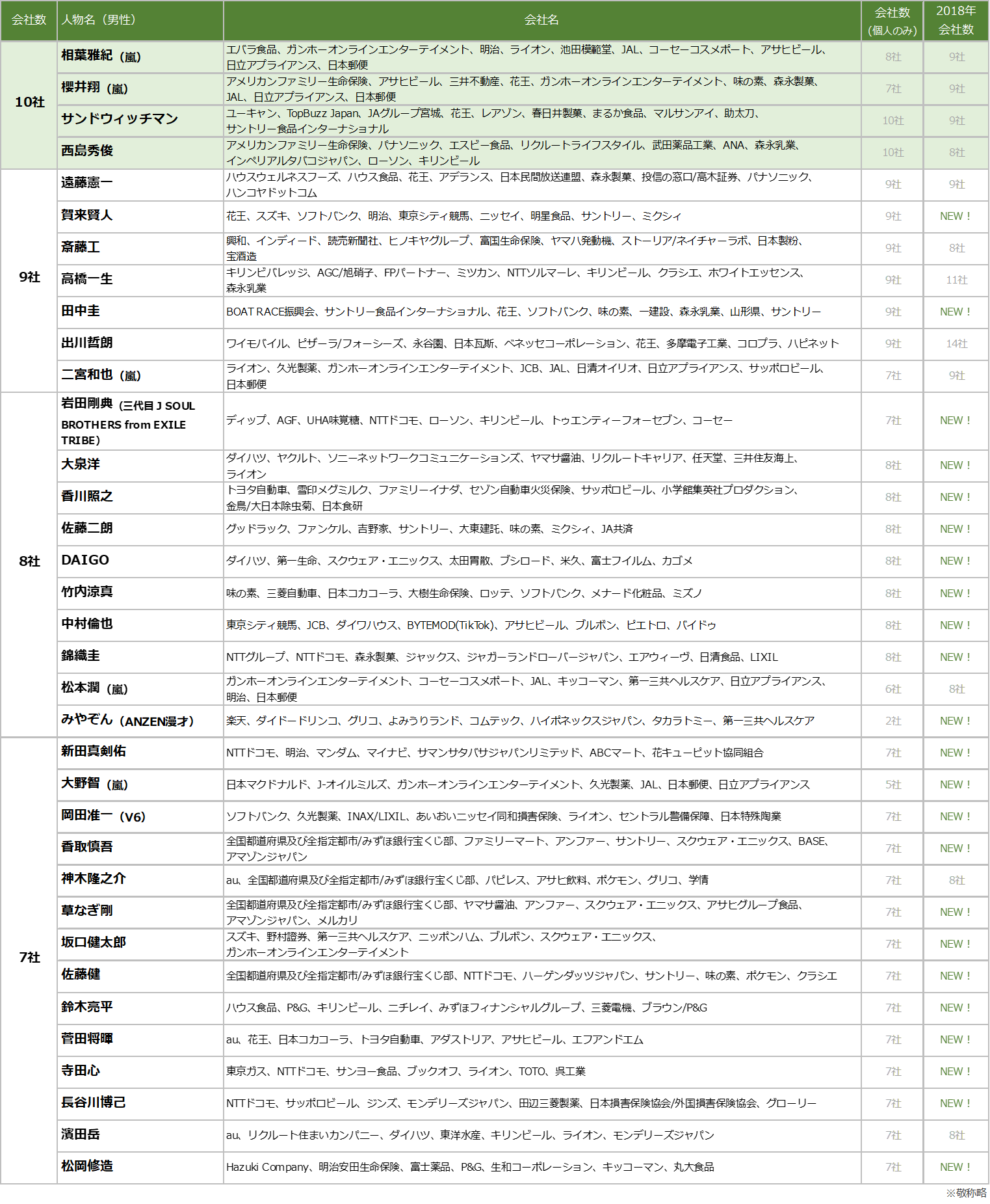 男性トップは、相葉雅紀さん、櫻井翔さん、サンドウィッチマンさん、西島秀俊さん(10社)