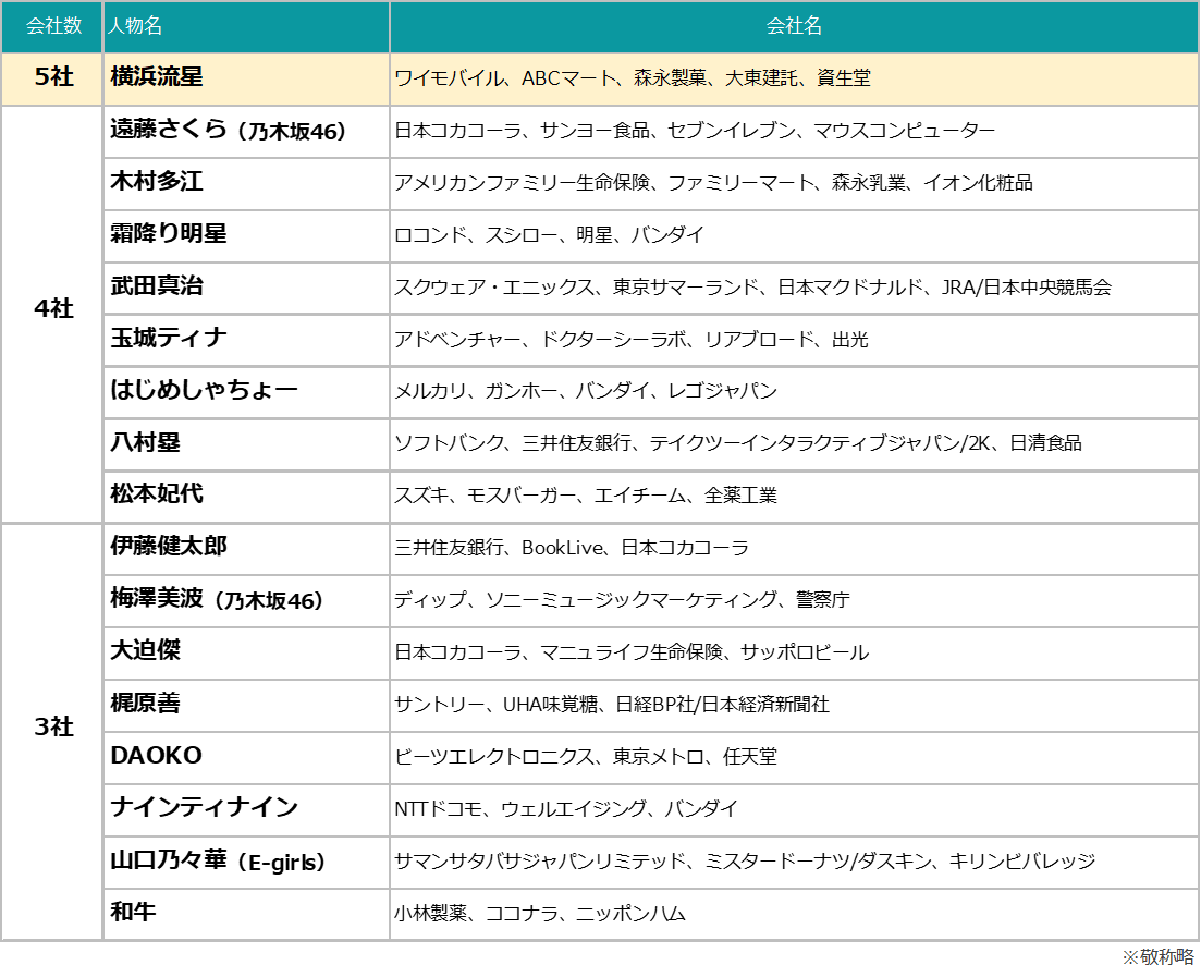 - 調査対象:日本テレビ、テレビ朝日、TBS、テレビ東京、フジテレビ(東京地区地上波キー局)で放送されたTV-CMに出演・登場した人物を対象。