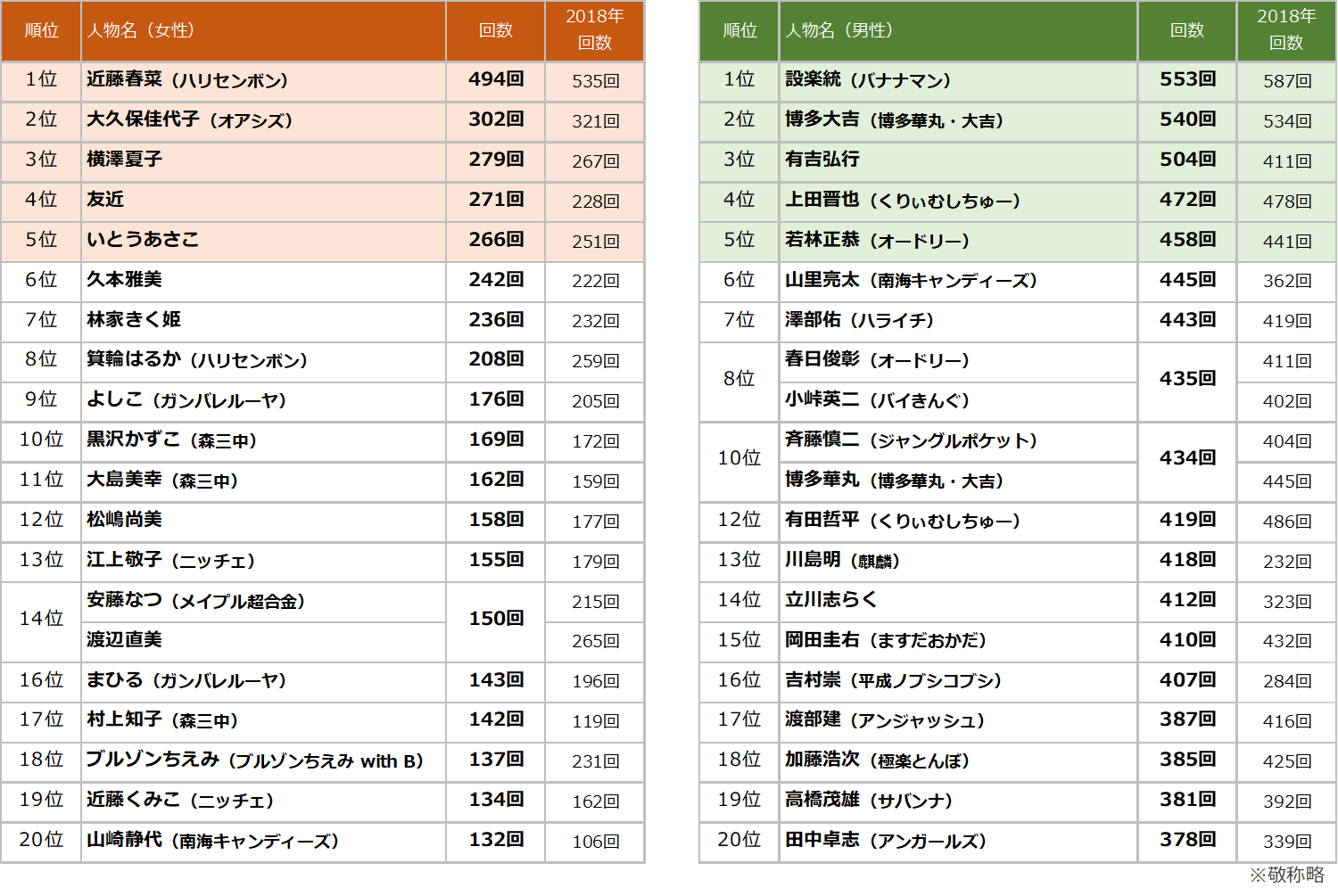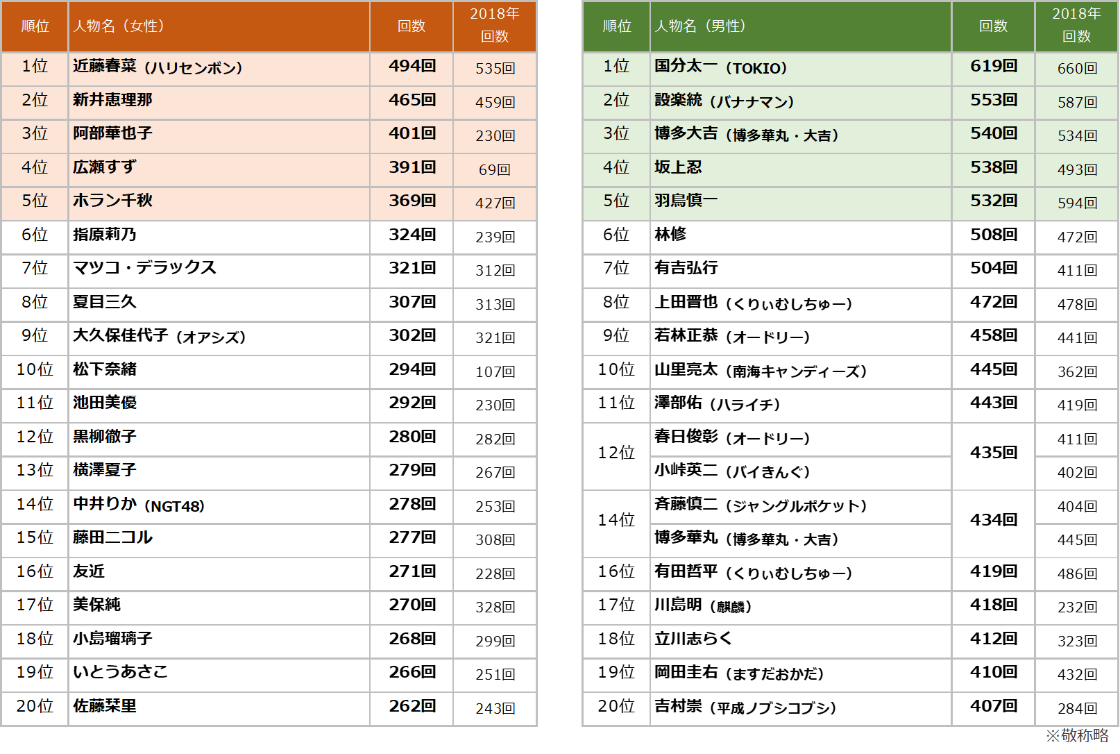 2019年TV番組出演ランキング(モデル・タレント・アイドル・音楽部門)