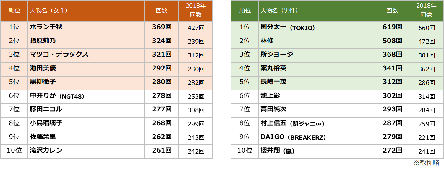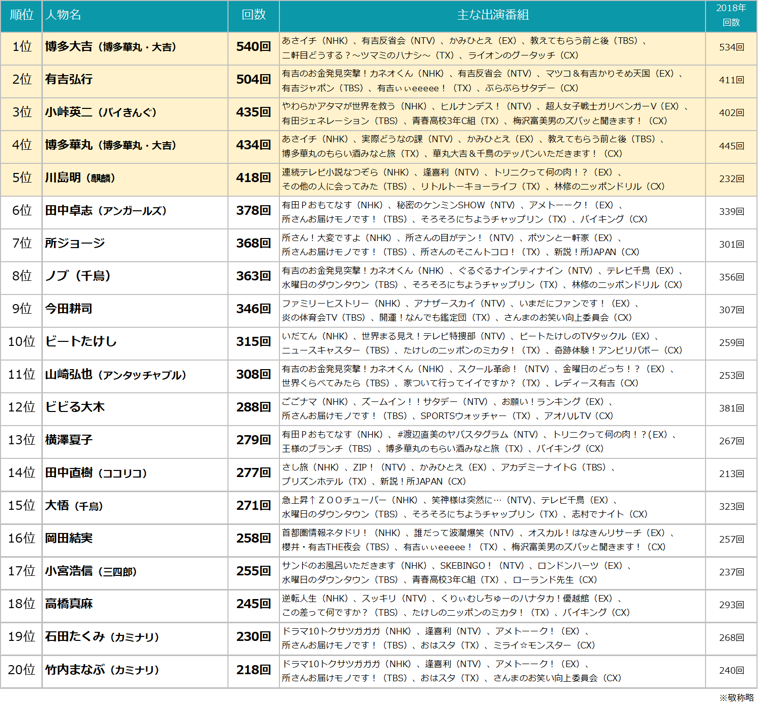 - 調査対象:NHK総合(Eテレ除く)、日本テレビ、テレビ朝日、TBS、テレビ東京、フジテレビ(東京地区地上波キー局)で放送されたTV番組(再放送番組含む)にレギュラー出演、ゲスト出演した人物を対象。