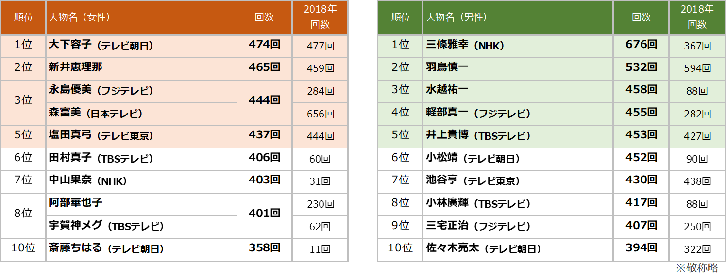2019年TV番組出演ランキング(アナウンサー・キャスター部門)